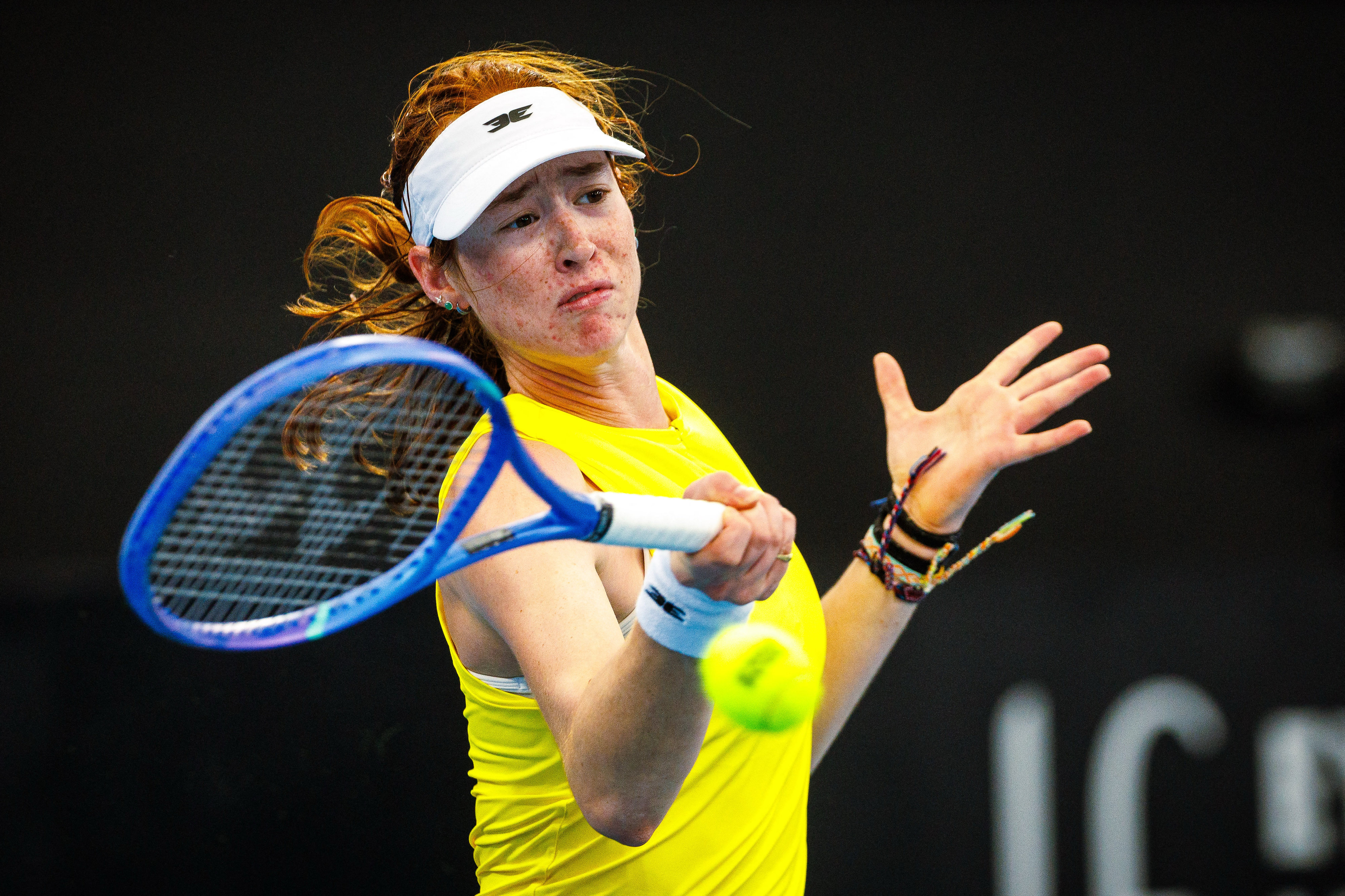 Australia's Maya Joint hits a return during the women's singles match against Kazakhstan's Yulia Putintseva at the Billie Jean King Cup at Patrick Rafter Tennis Centre in Brisbane on April 10, 2025. (Photo by Patrick Hamilton/AFP Photo)