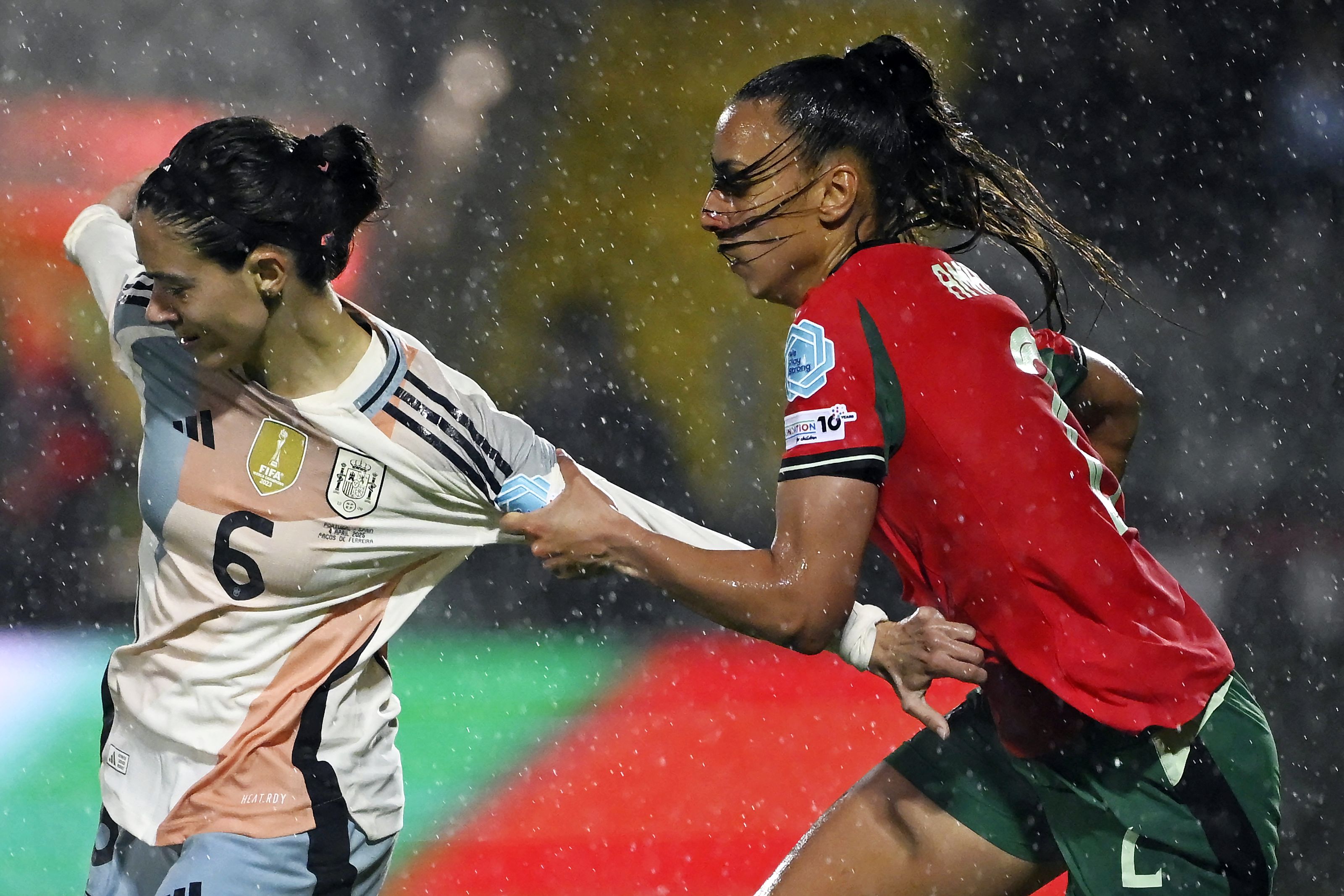 Portugal's defender #02 Catarina Amado (R) fights for the ball with Spain's midfielder #06 Aitana Bonmati during the UEFA Women's Nations League group A3 football match between Portugal and Spain in Capital do Movel stadium, Pacos de Ferreira on April 4, 2025. (Photo by Miguel Riopa/AFP Photo)