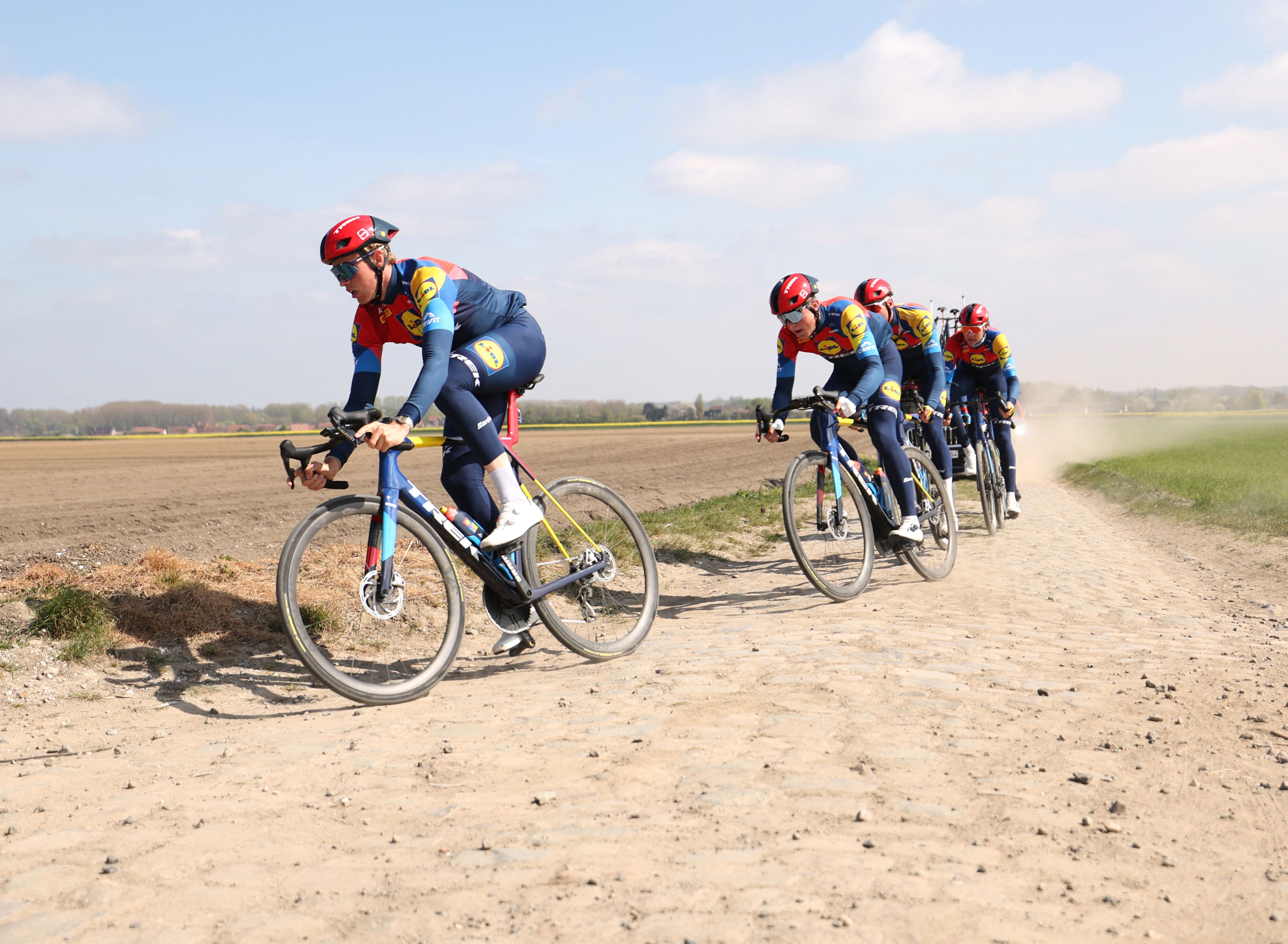 Team Lidl riders cycle on the paved sector during a reconnaissance ride for the 122nd edition of the Paris-Roubaix upcoming cycling event in Haveluy on April 10, 2025. The men's race of Paris-Roubaix which takes place on April 13, will see current rivals Slovenia's Tadej Pogacar and Netherlands' Mathieu Van der Poel duel over the cobbled roads near the Franco-Belgian border in the seasons latest “Monument” race. (Photo by Francois Lo Presti/AFP Photo)