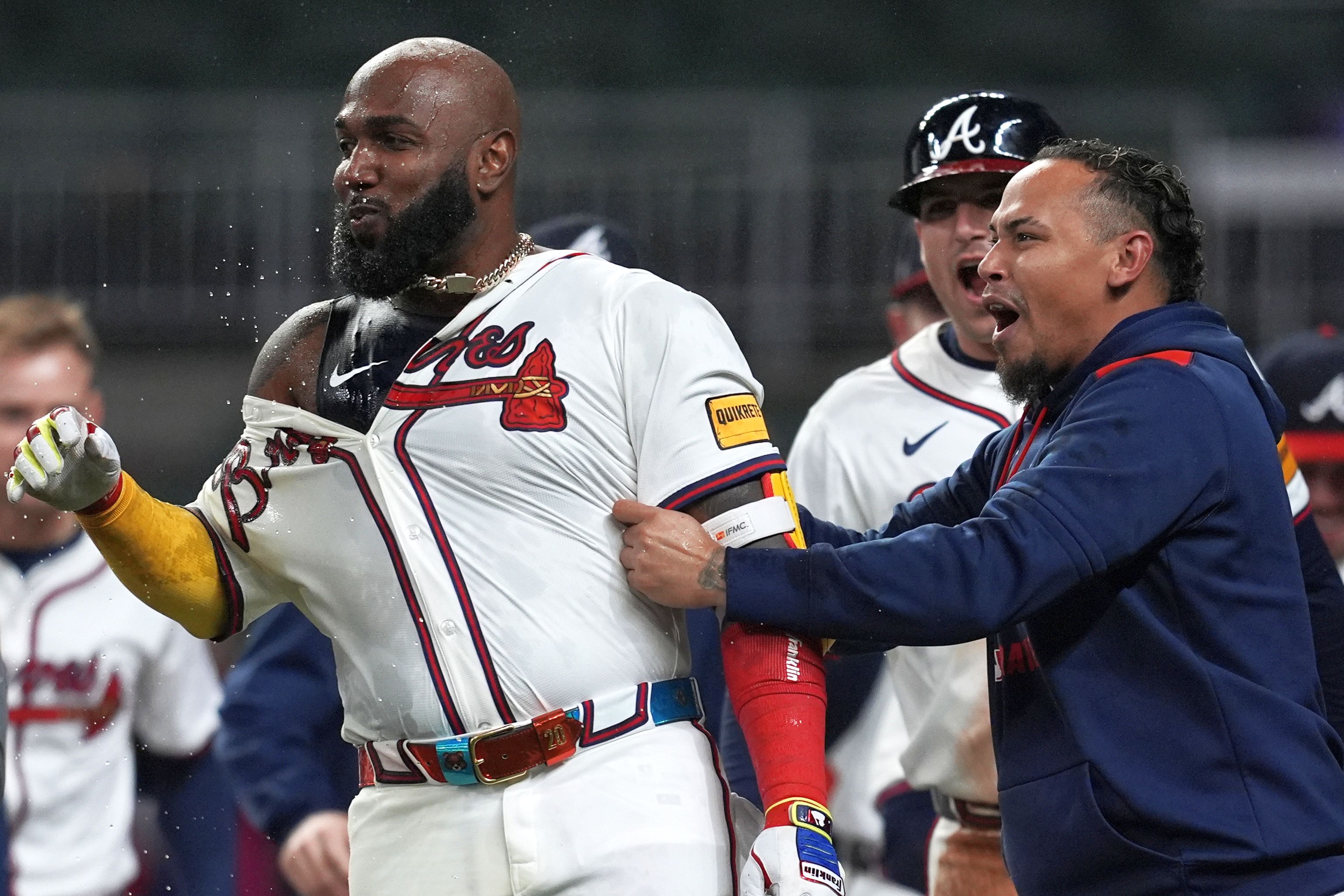 Atlanta Braves designated hitter Marcell Ozuna (20) celebrates with the team after he hit a walk-off two-run homer against the Philadelphia Phillies in the 11th inning of a baseball game after a rain delay, Friday, April 11, 2025, in Atlanta. (Photo by Mike Stewart/AP Photo)