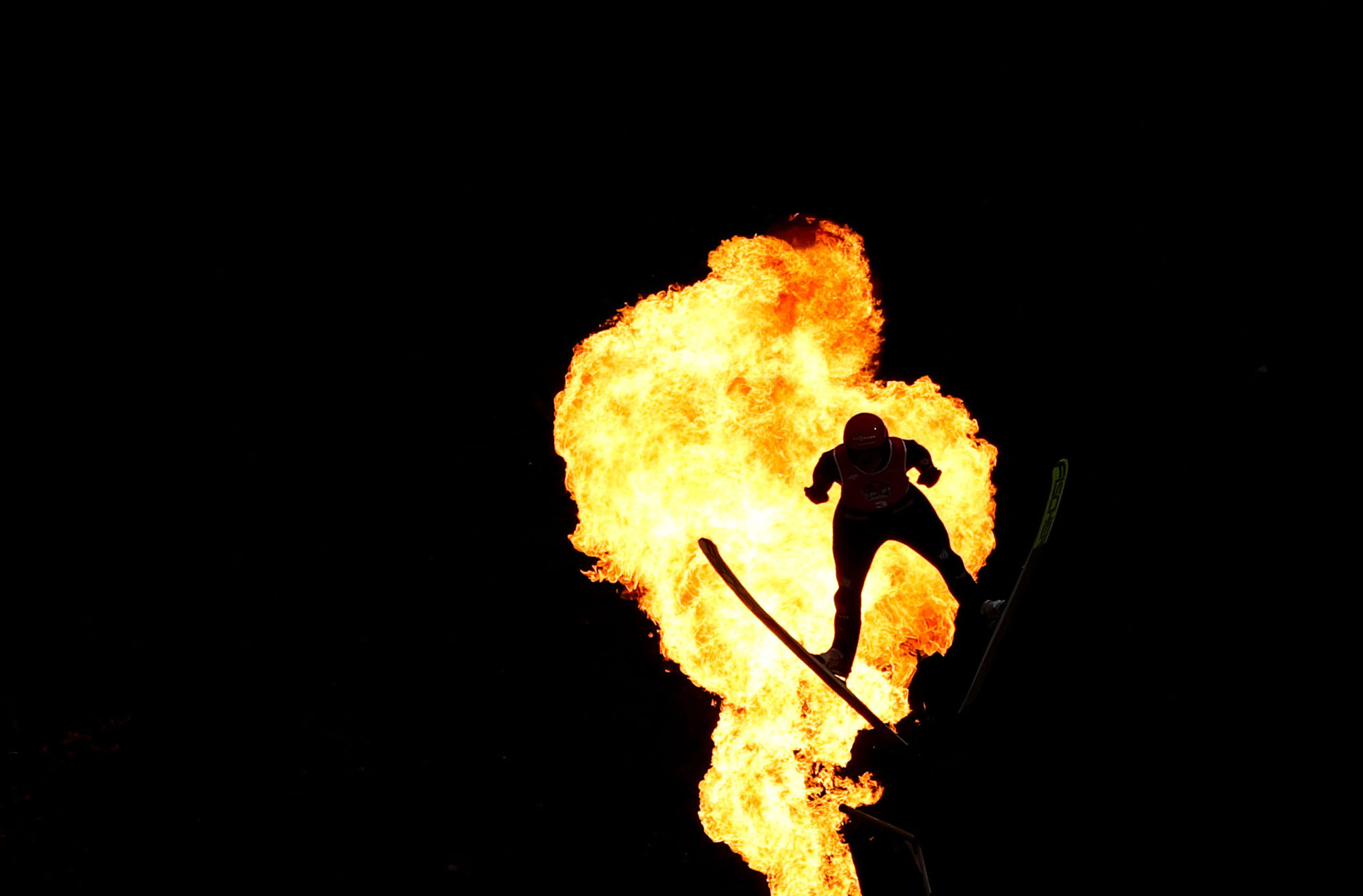 Karl Geiger during Red Bull Target Jumping at Wielka Krokiew ski jump in Zakopane, Poland on April 5, 2025. During the competition different than in traditional ski jumping, the winners were not those who jumped the farthest but those who managed to jump on the designated point. (Photo by Jakub Porzycki/Anadolu via Getty Images)