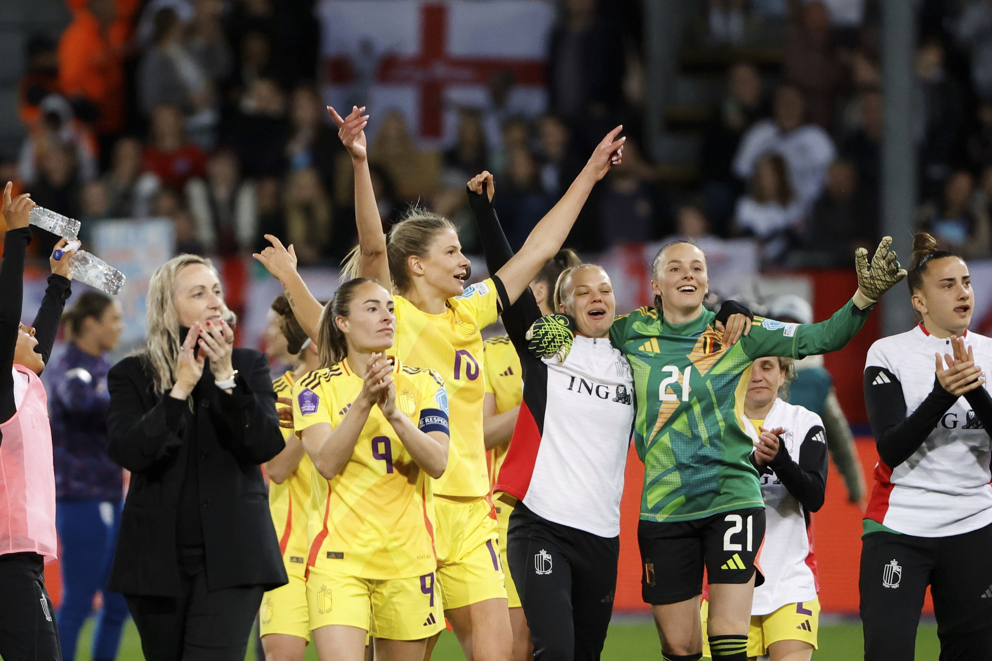 Belgium's coach Elisabet Gunnarsdottir, team captain Tessa Wullaert, Justine Vanhaevermaet and goalkeeper Lisa Lichtfus, from left, celebrate after defeating England 3-2 in their Women's Nations League soccer match at Den Dreef Stadium in Leuven, Belgium, Tuesday, April 8, 2025. (Photo by Omar Havana/AP Photo)