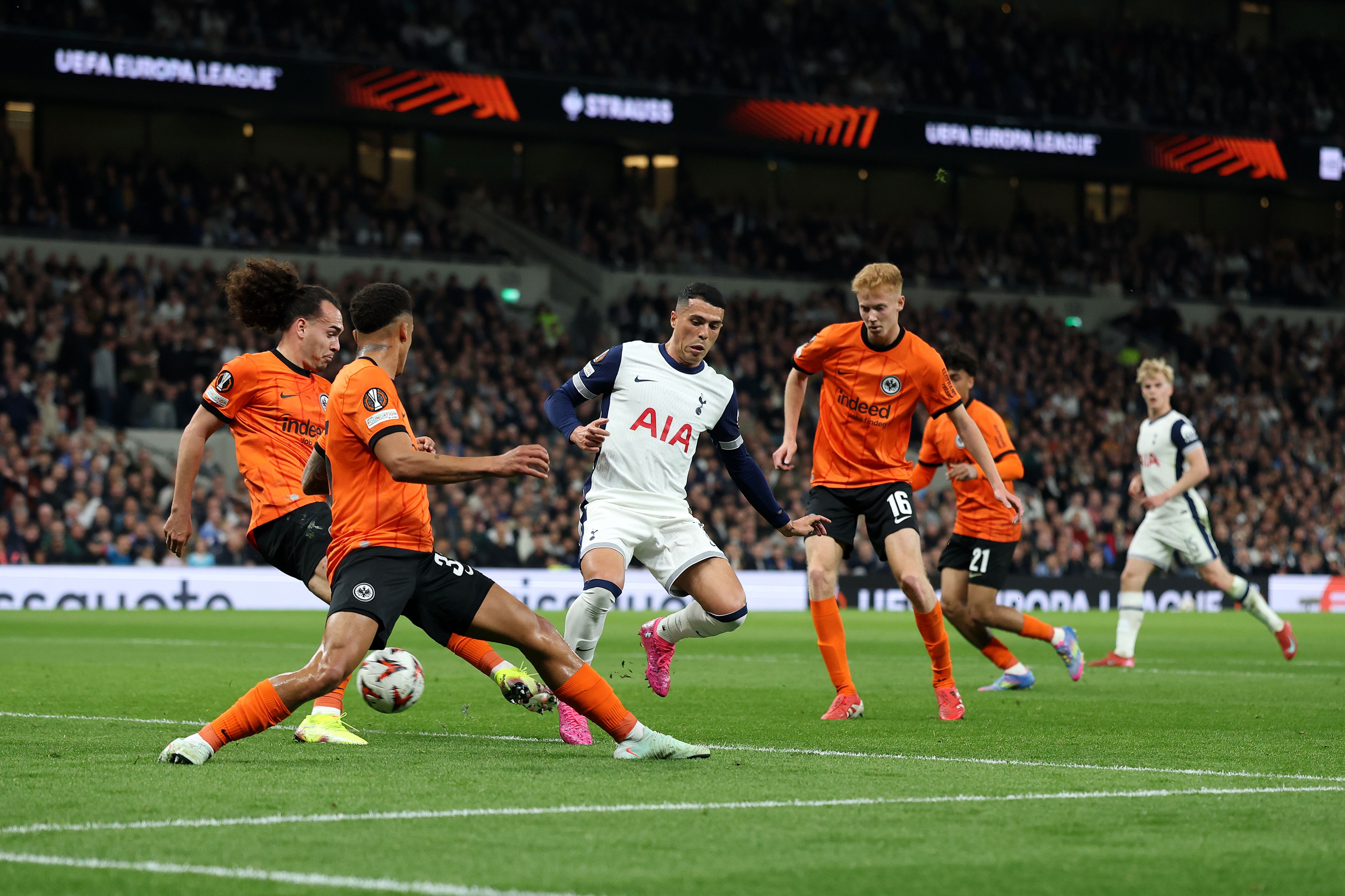 Pedro Porro of Tottenham Hotspur scores his team's first goal whilst under pressure from Arthur Theate and Tuta of Eintracht Frankfurt during the UEFA Europa League 2024/25 Quarter Final First Leg match between Tottenham Hotspur and Eintracht Frankfurt at Tottenham Hotspur Stadium on April 10, 2025 in London, England. (Photo by Alex Pantling/Getty Images)