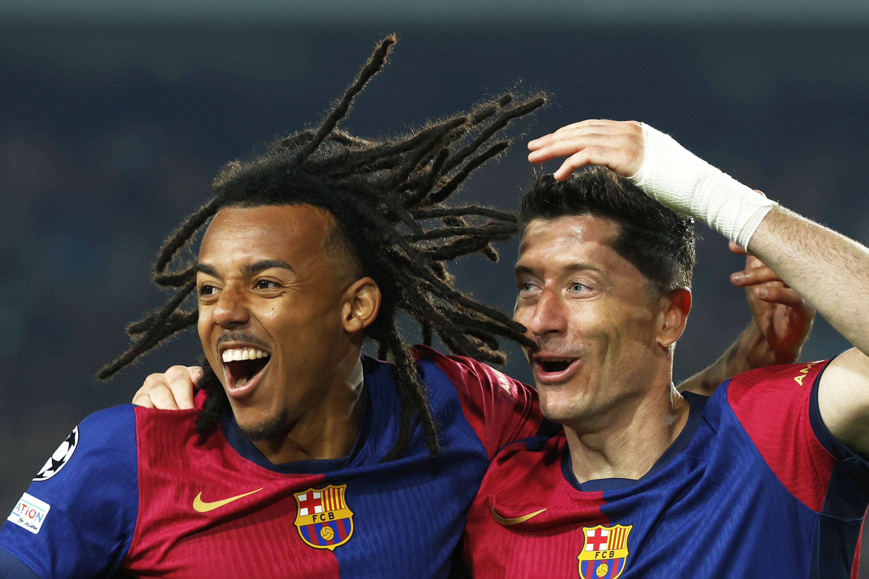 Barcelona's Robert Lewandowski, right, celebrates with Barcelona's Jules Kounde after scoring his side's second goal during the Champions League quarterfinals first leg soccer match between Barcelona and Borussia Dortmund, at the Lluis Companys Olympic stadium in Barcelona, Spain, Wednesday, April 9, 2025. (Photo by Joan Monfort/AP Photo)