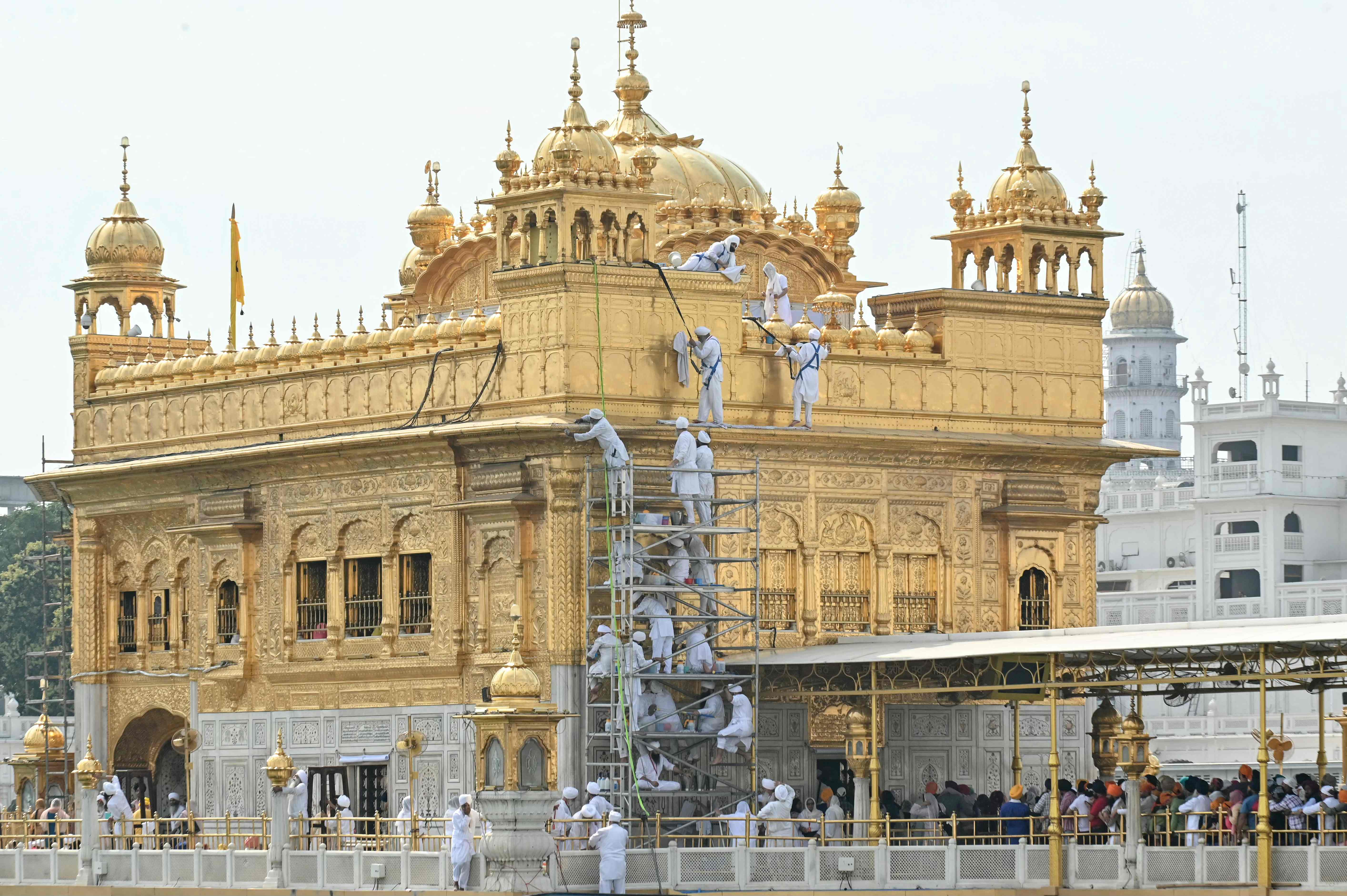 Volunteers from Birmingham in Britain with the Sikh charitable organisation Guru Nanak Nishkam Sewak Jatha (GNNSJ) clean the gold plating of the Golden Temple in Amritsar on March 19, 2025. (Photo by Narinder Nanu/AFP Photo)