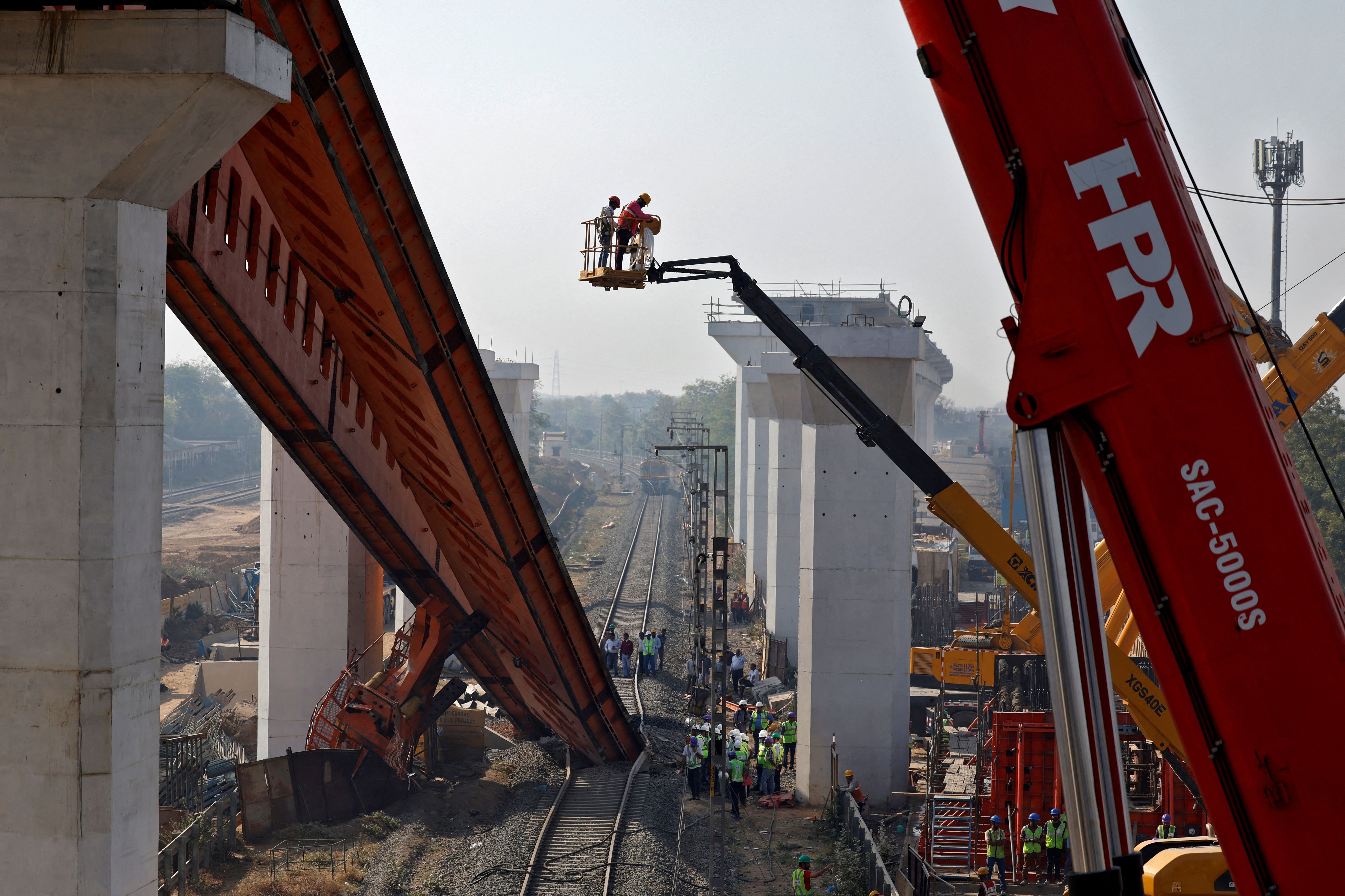 Employees of National High Speed Railway Corporation Limited (NHSRCL) work on restoration after a slab-launching crane collapsed between two pillars, near a massive gantry that used to install concrete girders between pillars on the bullet train line of Ahmedabad-Mumbai bullet train project, on the outskirts of Ahmedabad, India, on March 24, 2025. (Photo by Amit Dave/Reuters)