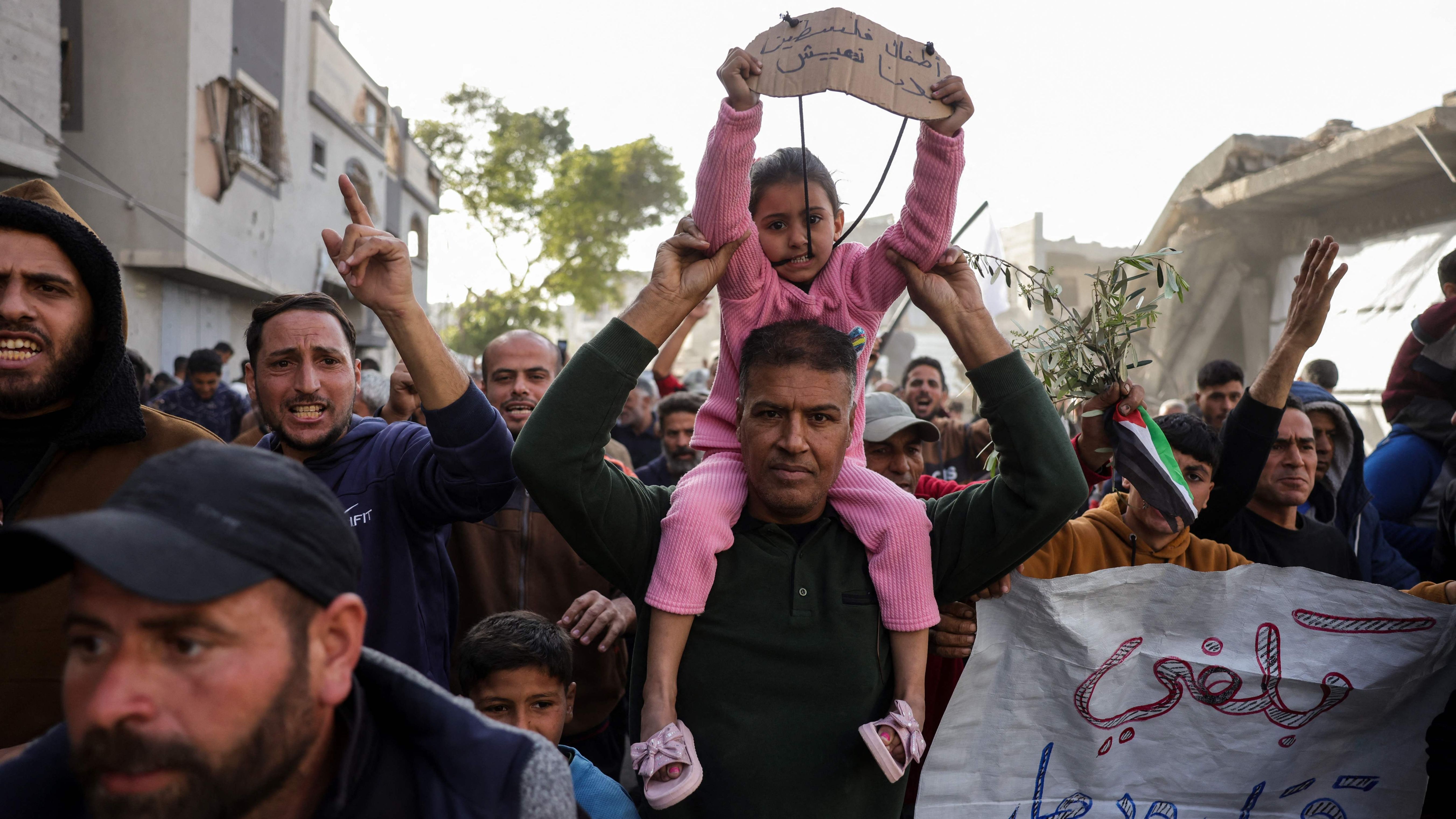 A slogan in Arabic reading (R): “Enough killing and destruction” and another reading (L): “The children of Palestine: We want to live” are displayed during a rally calling for an end to the war, in Beit Lahia, in the northern Gaza Strip, on March 25, 2025. Hundreds of Palestinians chanted anti-Hamas slogans at a protest in northern Gaza on March 25, calling for an end to the war with Israel, witnesses said. (Photo by AFP Photo)