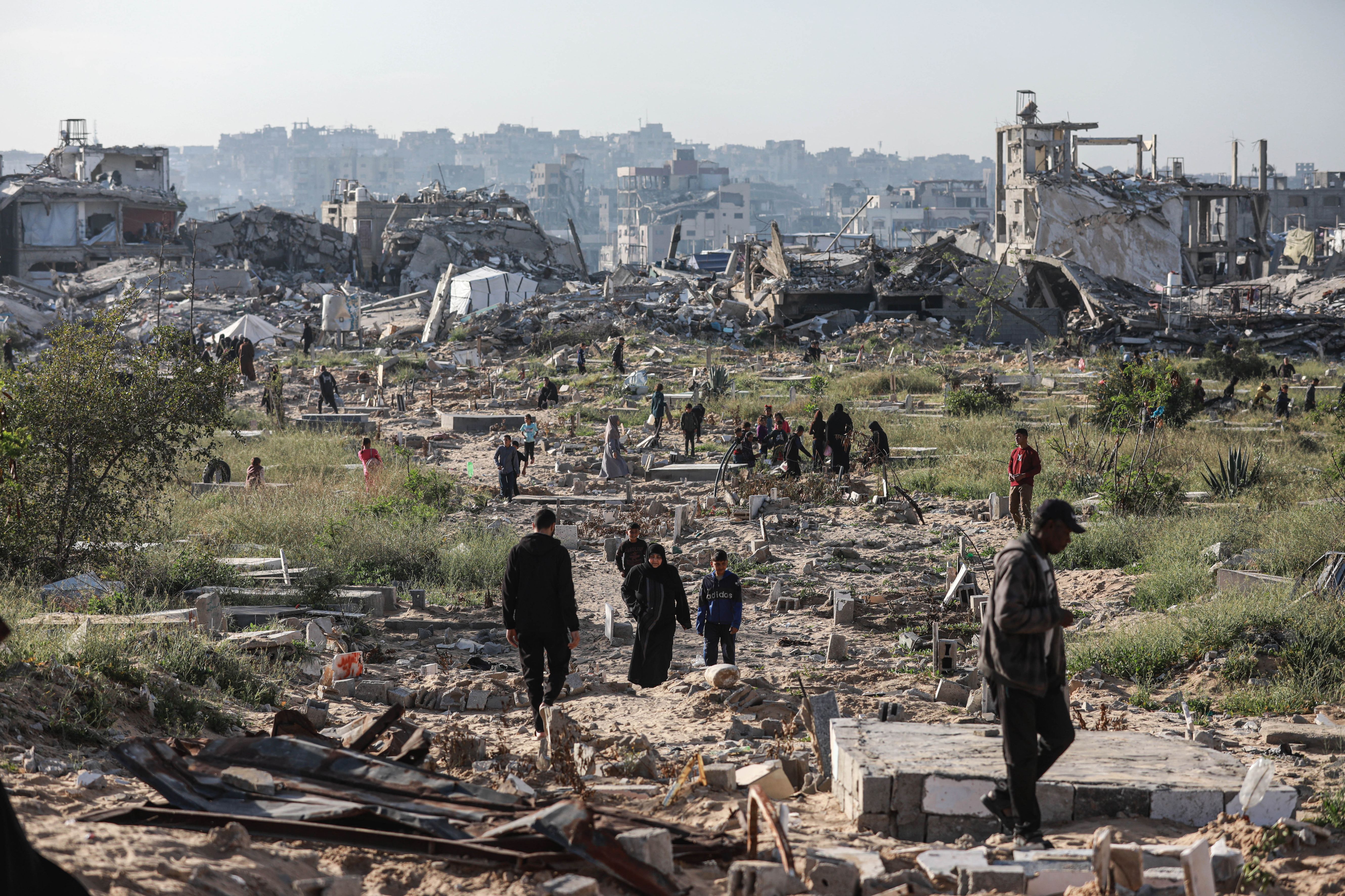 Palestinians visit the city cemetery damaged by Israeli attacks after performing the Eid al-Fitr prayer marking the end of the holy month of Ramadan in Beit Lahia, Gaza on March 30, 2025. (Photo by Abdalhkem Abu Riash/Anadolu via Getty Images)