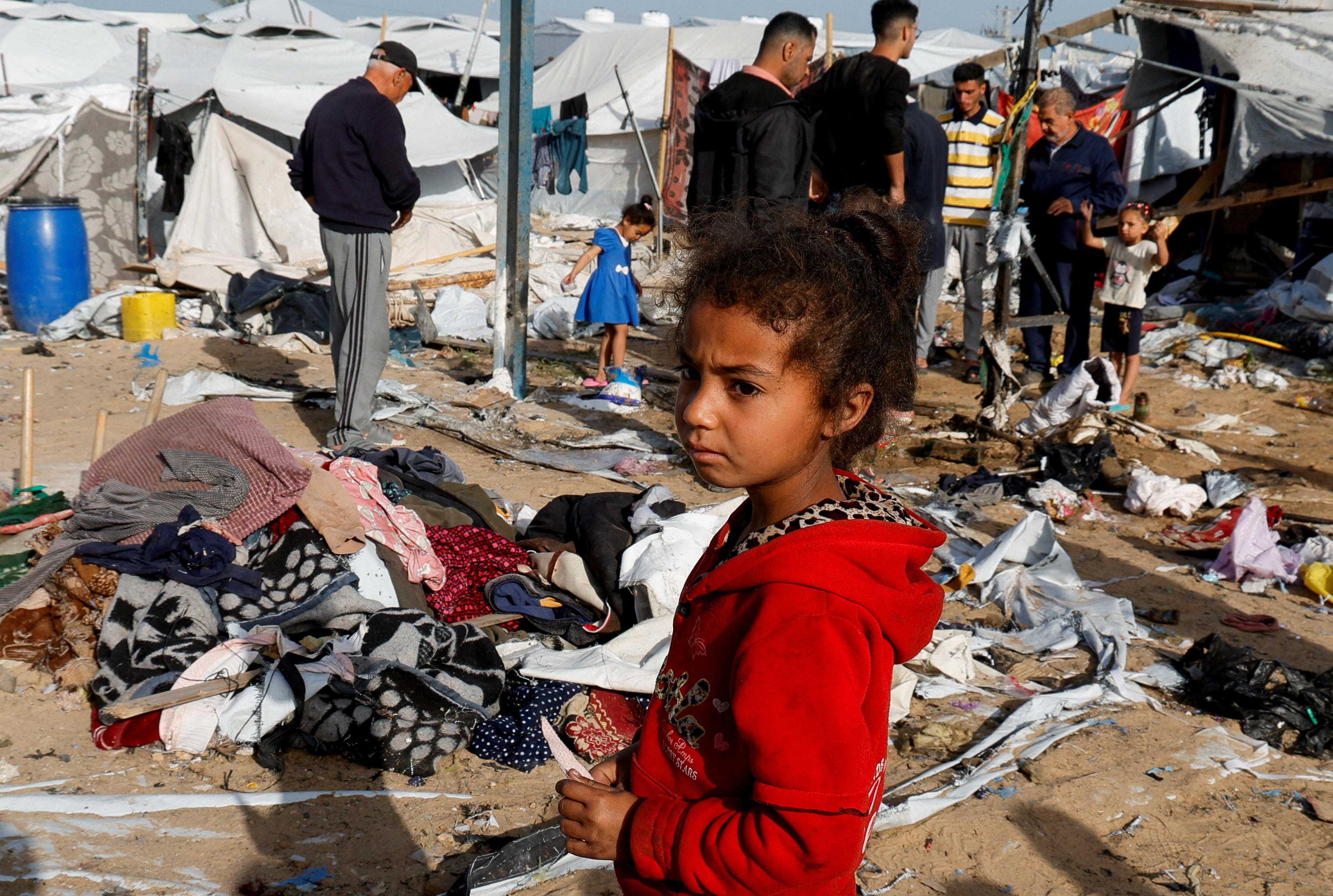 A Palestinian child looks on at the site of an Israeli strike on a tent site housing displaced people, in Khan Younis, in the southern Gaza Strip, on April 3, 2025. (Photo by Hatem Khaled/Reuters)