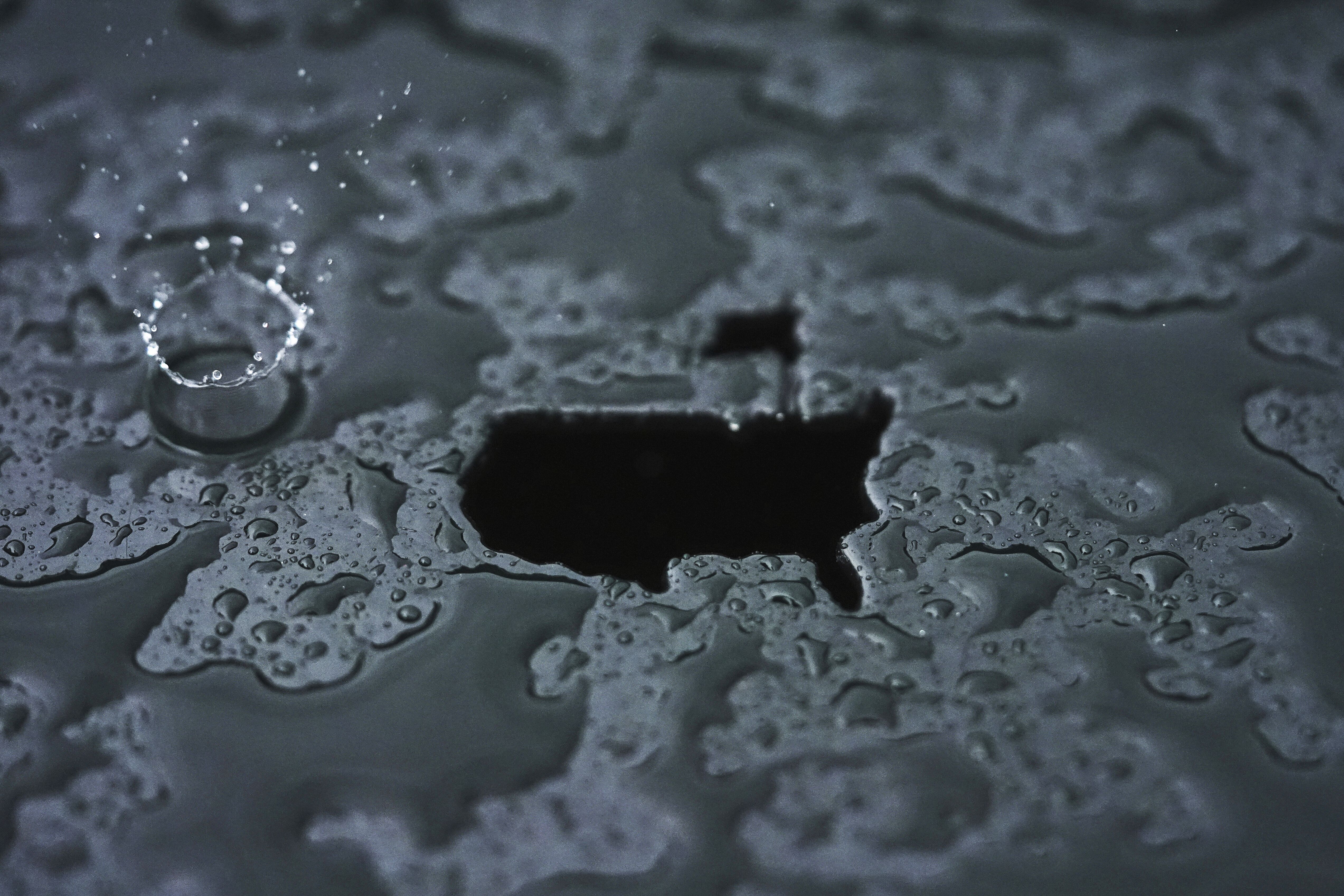 A raindrop splashes alongside a Masters Tournament logo at the Augusta National Golf Club in Georgia, April 7, 2025. (Photo by Matt Slocum/AP Photo)