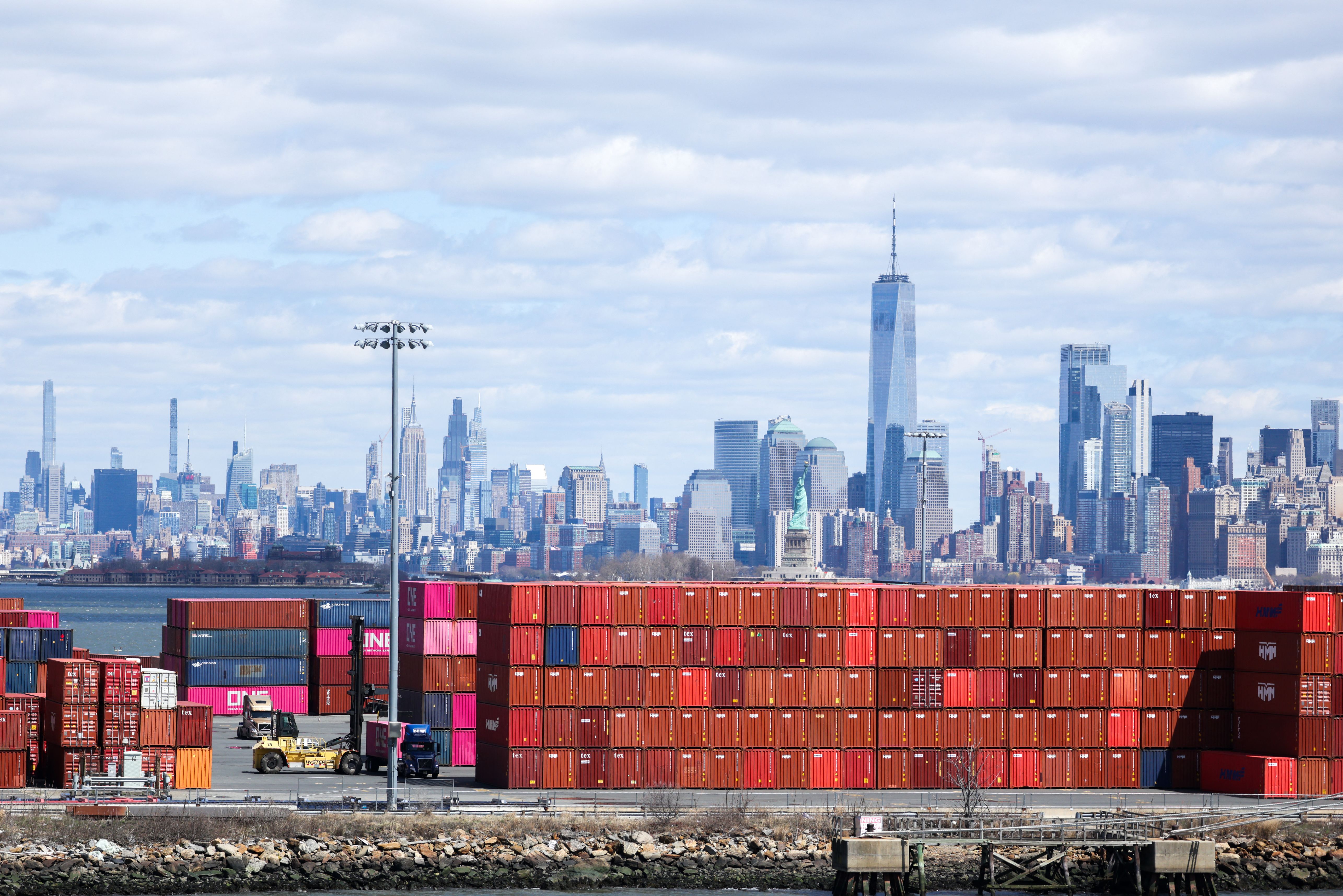 Shipping containers are seen at the Port Jersey Container Terminal, with the Manhattan skyline in the distance, in Jersey City, New Jersey on April 8, 2025. China vowed Tuesday to “fight to the end” after US President Donald Trump threatened to further ramp up tariffs but the EU warned against escalating a trade war that has rocked global markets. Trump has upended the world economy with sweeping tariffs that have raised the spectre of an international recession, but has ruled out any pause in his aggressive trade policy despite a dramatic market sell-off. (Photo by Charly Triballeau/AFP Photo)
