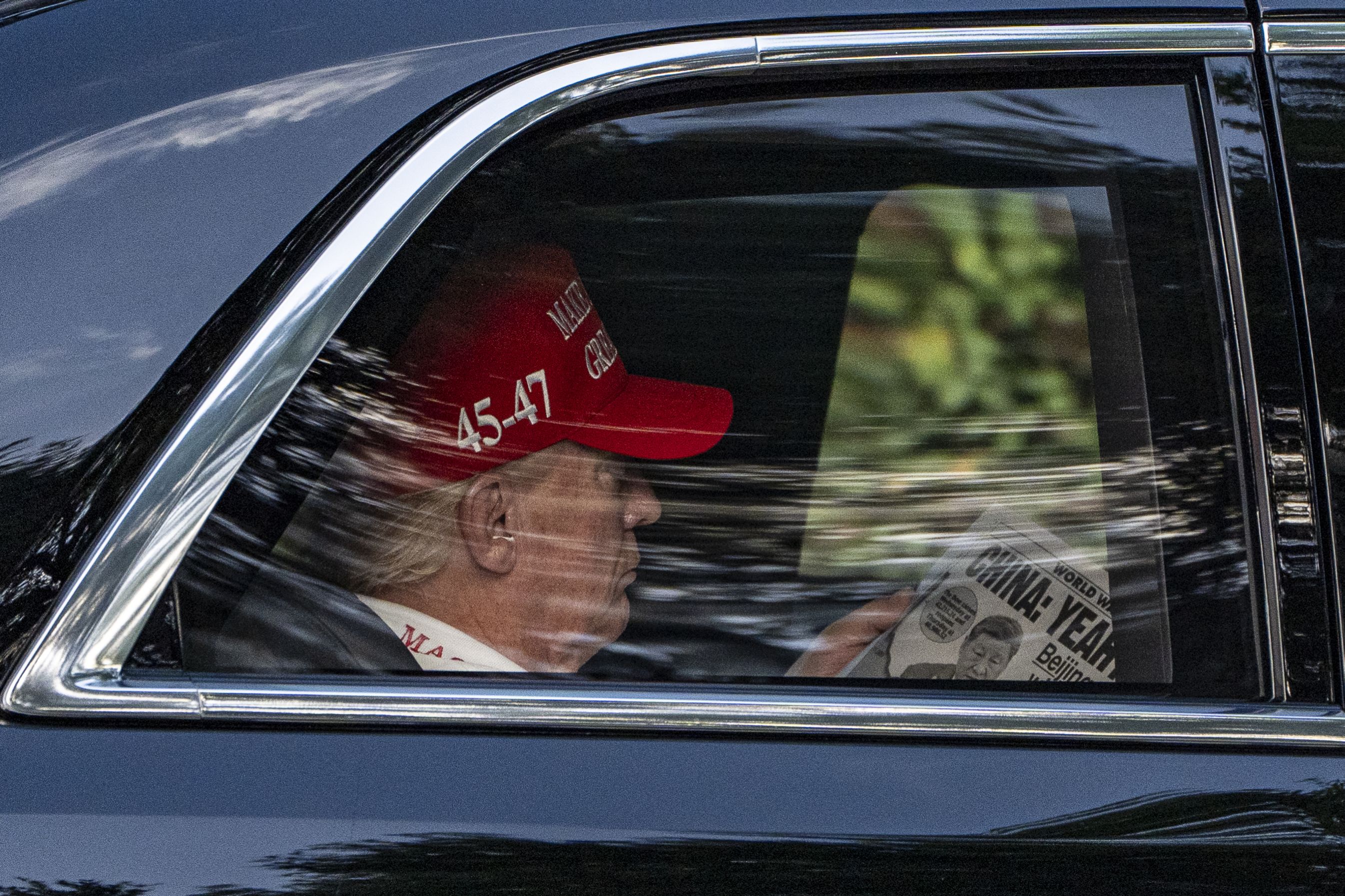 President Donald Trump reads The NY Post as he arrives at Trump National Golf Club, Saturday, April 5, 2025, in Jupiter, Fla. (Photo by Alex Brandon/AP Photo)