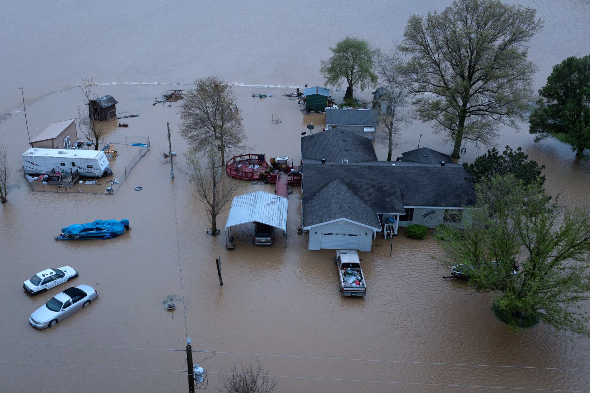 An aerial view shows floodwaters surrounding a rural home on April 06, 2025 near Poplar Bluff, Missouri. Thunderstorms, heavy rains, high winds and tornadoes have plagued the regions for the past several days causing widespread damage. (Photo by Scott Olson/Getty Images)