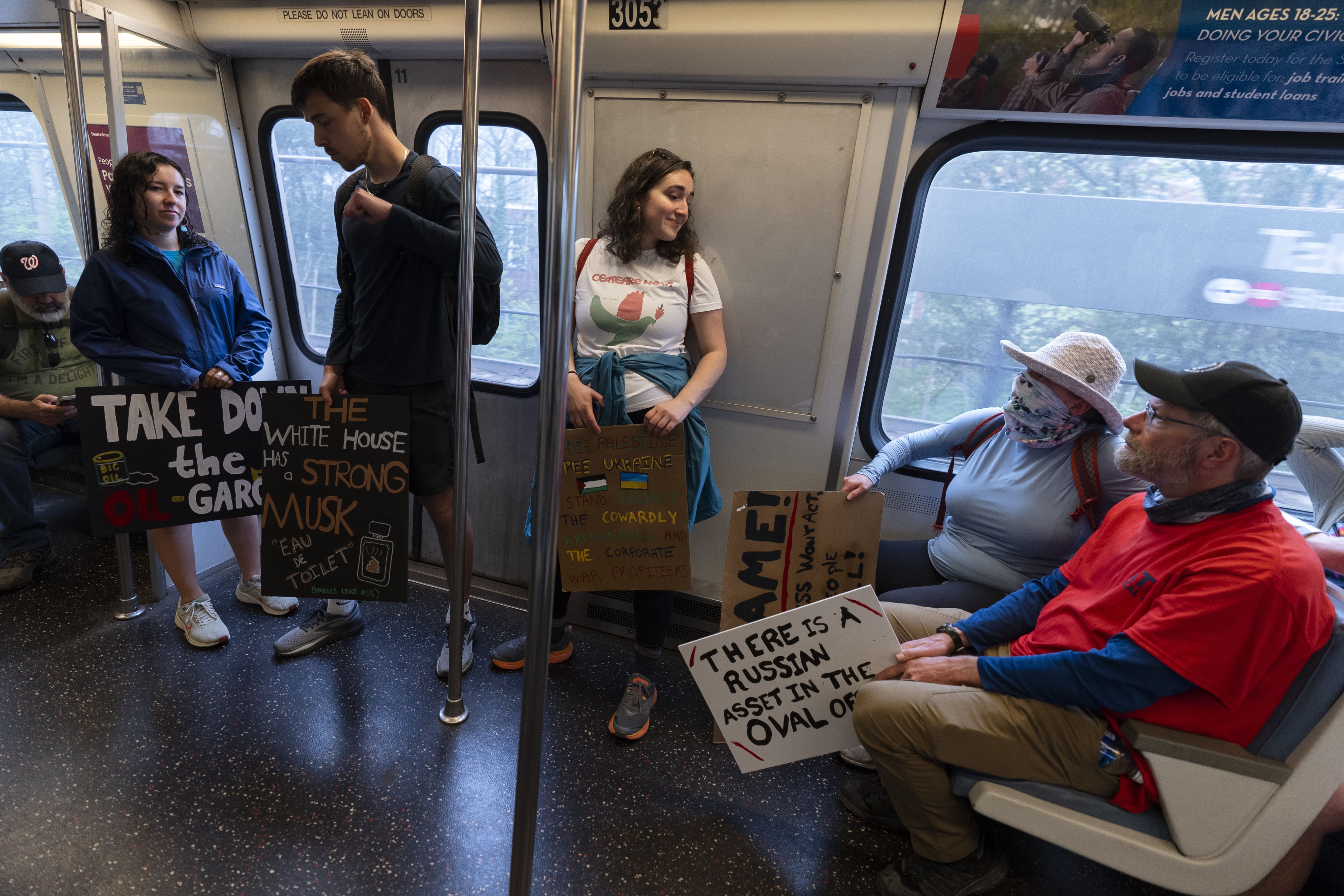 Metro train riders carry signs before attending a rally to protest President Donald Trump and Elon Musk, Saturday, April 5, 2025, in Washington. (Photo by Manuel Balce Ceneta/AP Photo)