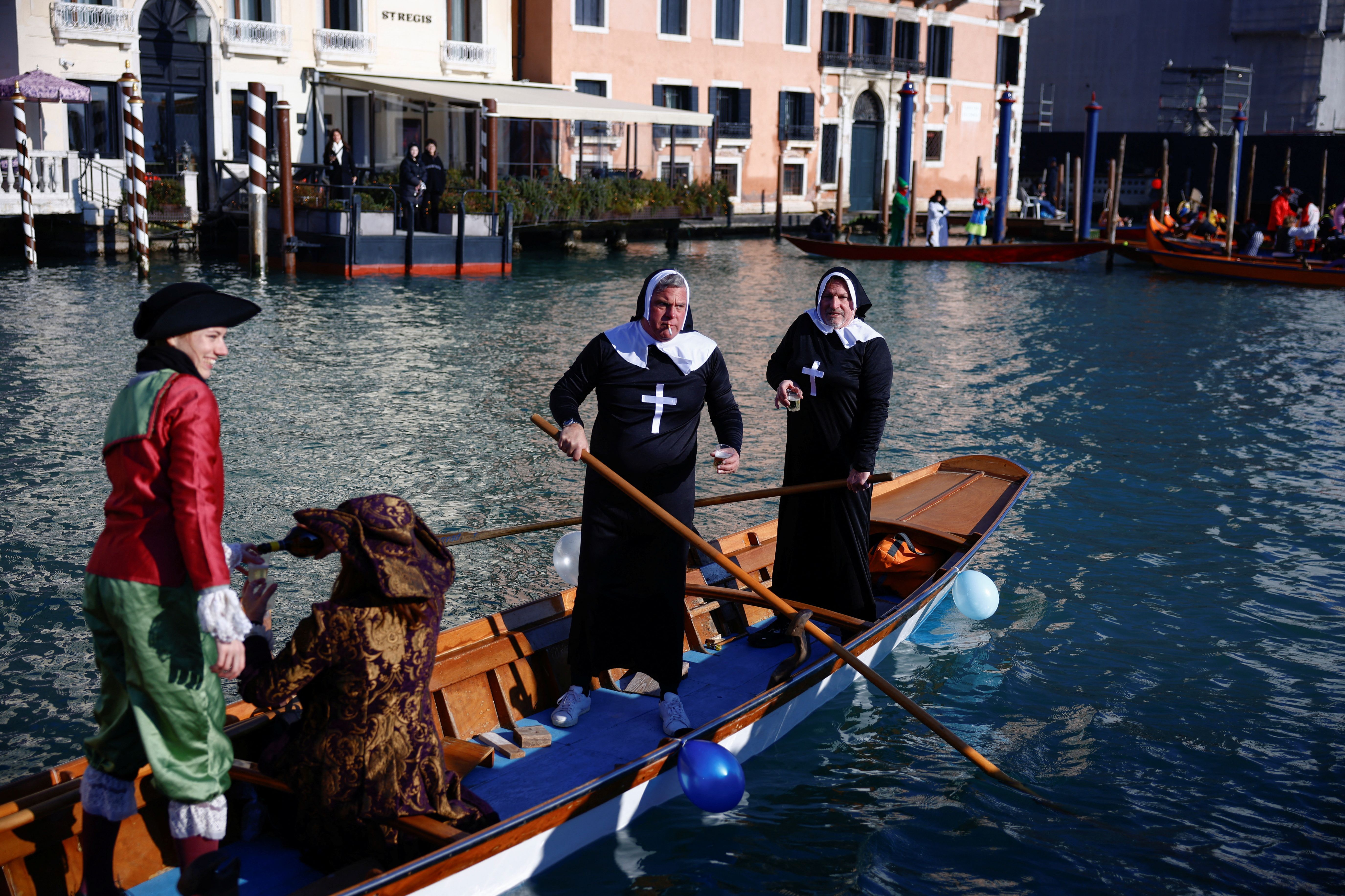 Revelers dressed as nuns participate in the Venice Carnival in Venice, Italy on January 28, 2024. (Photo by Guglielmo Mangiapane/Reuters)
