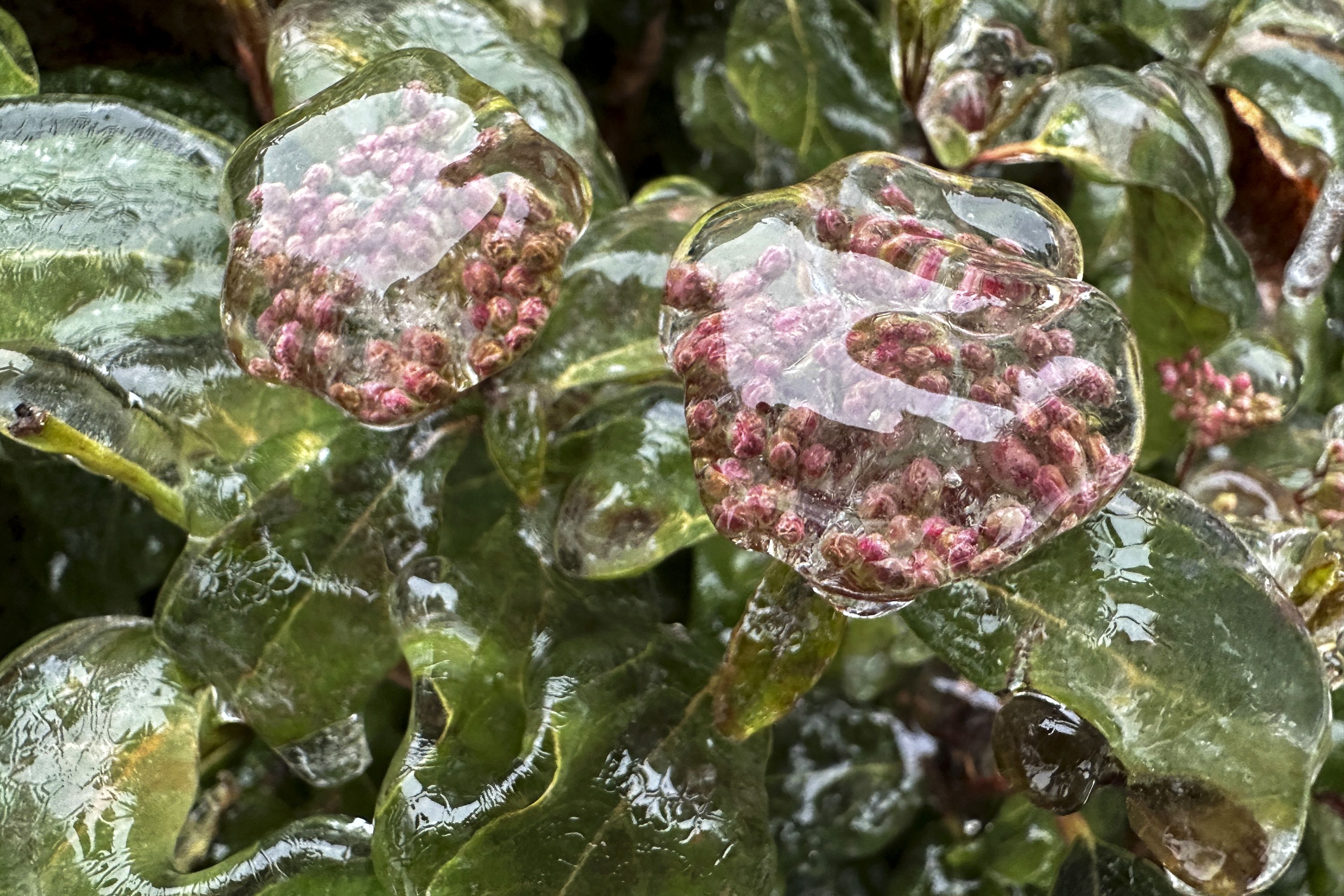 Ice covers flowers on Wednesday, January 17, 2024, in Lake Oswego, Ore. An ice storm threatened to topple towering trees onto power lines and turned mountain highways treacherous Wednesday in the Pacific Northwest, where residents were urged to avoid travel. (Photo by Gillian Flaccus/AP Photo)