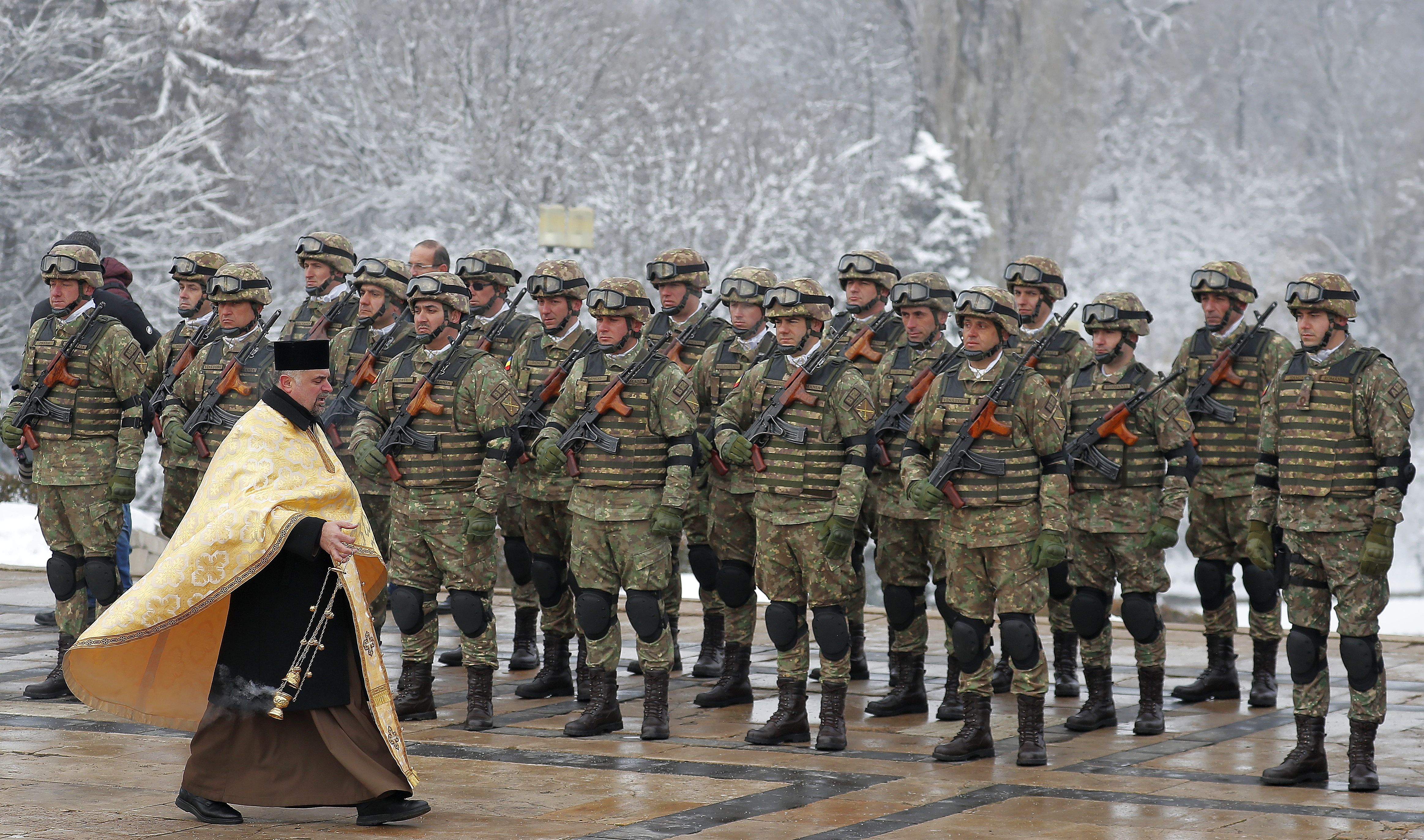 Paratroopers of the General Staff of the Land Forces are blessed by a military priest during a religious ceremony held in front of the Unknown Soldier Memorial to mark the 165th anniversary of the Unification of the Romanian Principalities, in Bucharest, Romania, 24 January 2024. The Day of the Unification of the Romanian Principalities, also known as the “Little Union Day”, is a public holiday of Romania that is celebrated every 24 January in order to commemorate the unification of the Romanian Principalities, performed on 24 January 1859 under the prince Alexandru Ioan Cuza. (Photo by Robert Ghement/EPA)