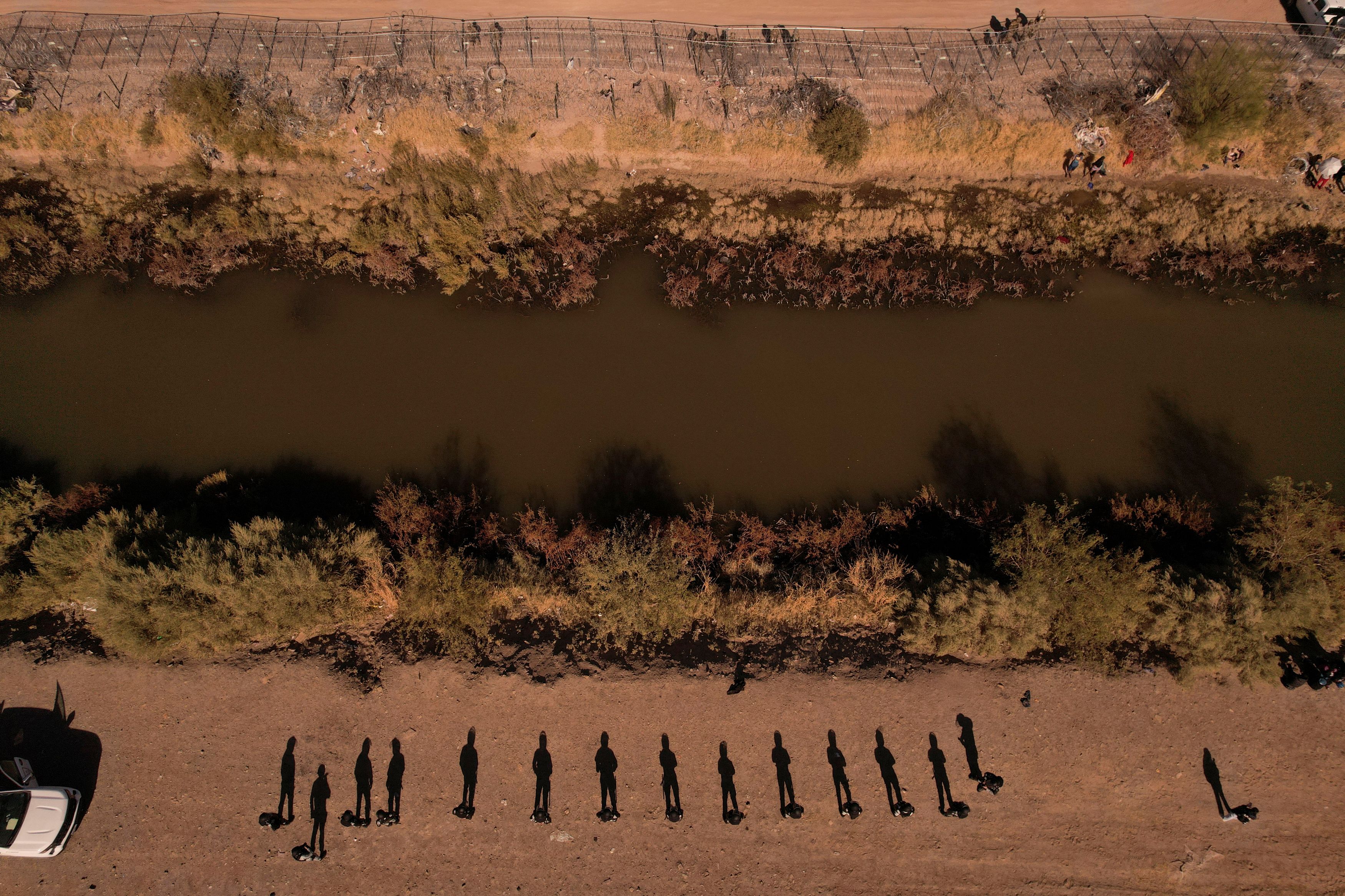 A drone view of members of the Mexican National Guard in riot gear, standing guard near the Rio Bravo river, after rumours spread that migrants would be allowed to enter the United States, according to local media, in Ciudad Juarez, Mexico on December 18, 2024. (Photo by Jose Luis Gonzalez/Reuters)