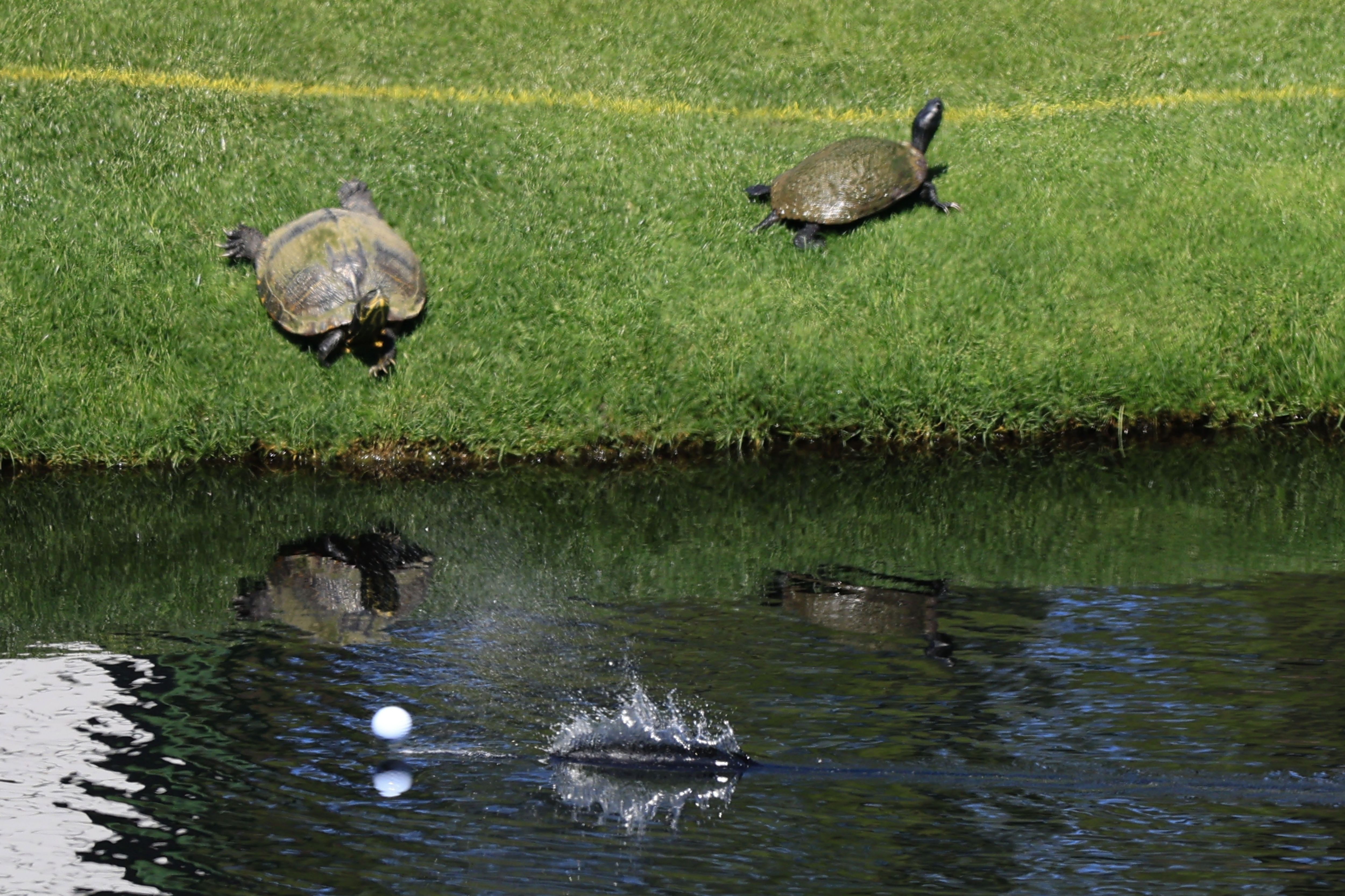 A golf ball skips the water in front of two turtles near the 16th green during a practice round for the 2025 Masters Tournament at the Augusta National Golf Club in Augusta, Georgia, USA, 08 April 2025. (Photo by Cj Gunther/EPA/EFE)