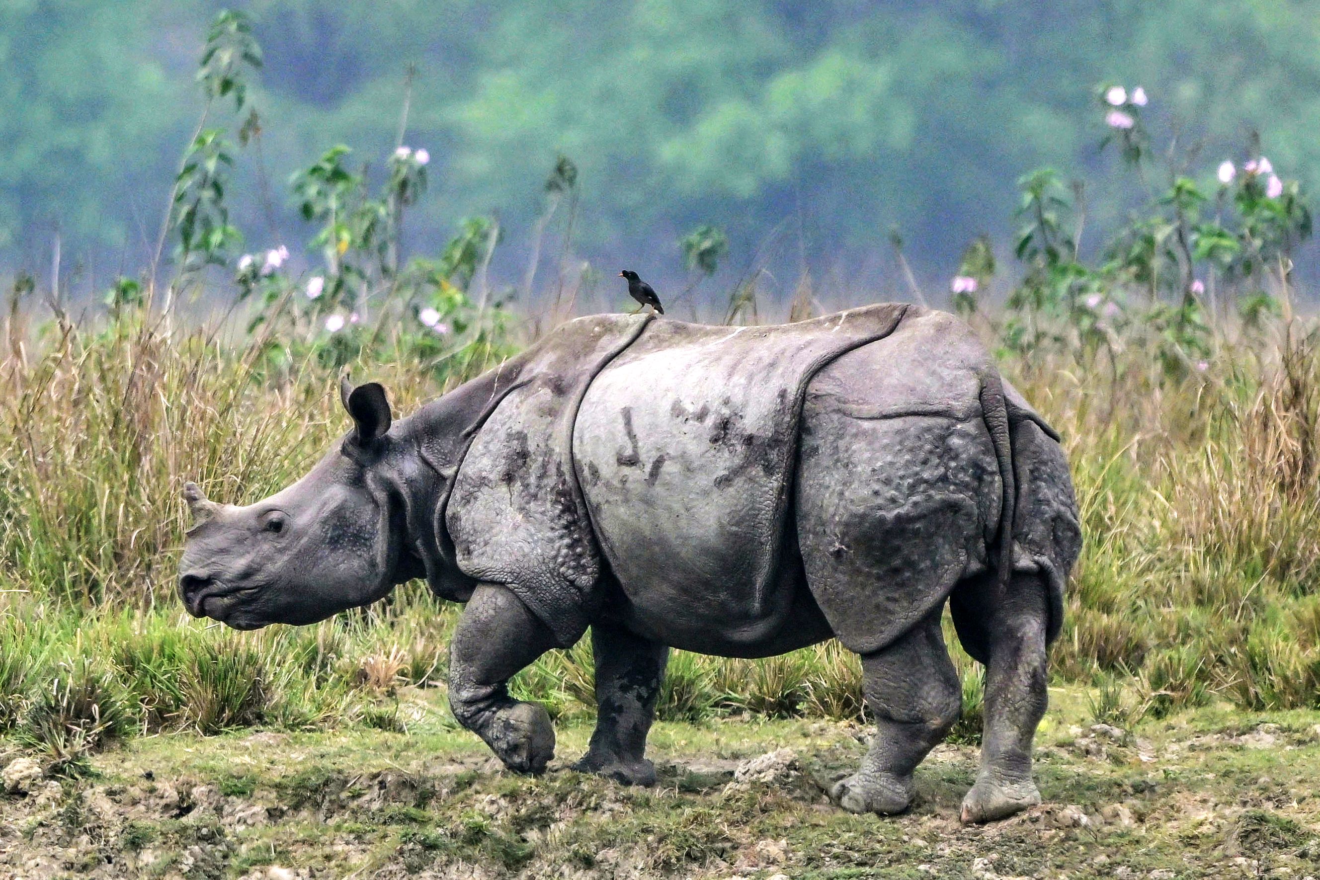 An Indian one-horned rhinoceros grazes on a dry wetland at the Pobitora Wildlife Sanctuary on the southern bank of the Brahmaputra River in Morigaon district of India's Assam state on April 4, 2025. (Photo by Biju Boro/AFP Photo)