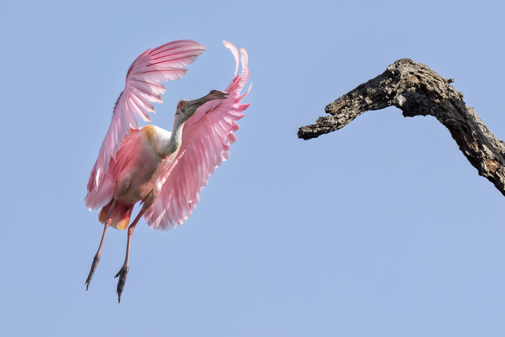 Roseate Spoonbill coming in for a landing on a tree at a bird rookery in St. Augustine, Florida, on April 3, 2025. (Photo by Ronen Tivony/ZUMA Press Wire/Rex Features/Shutterstock)