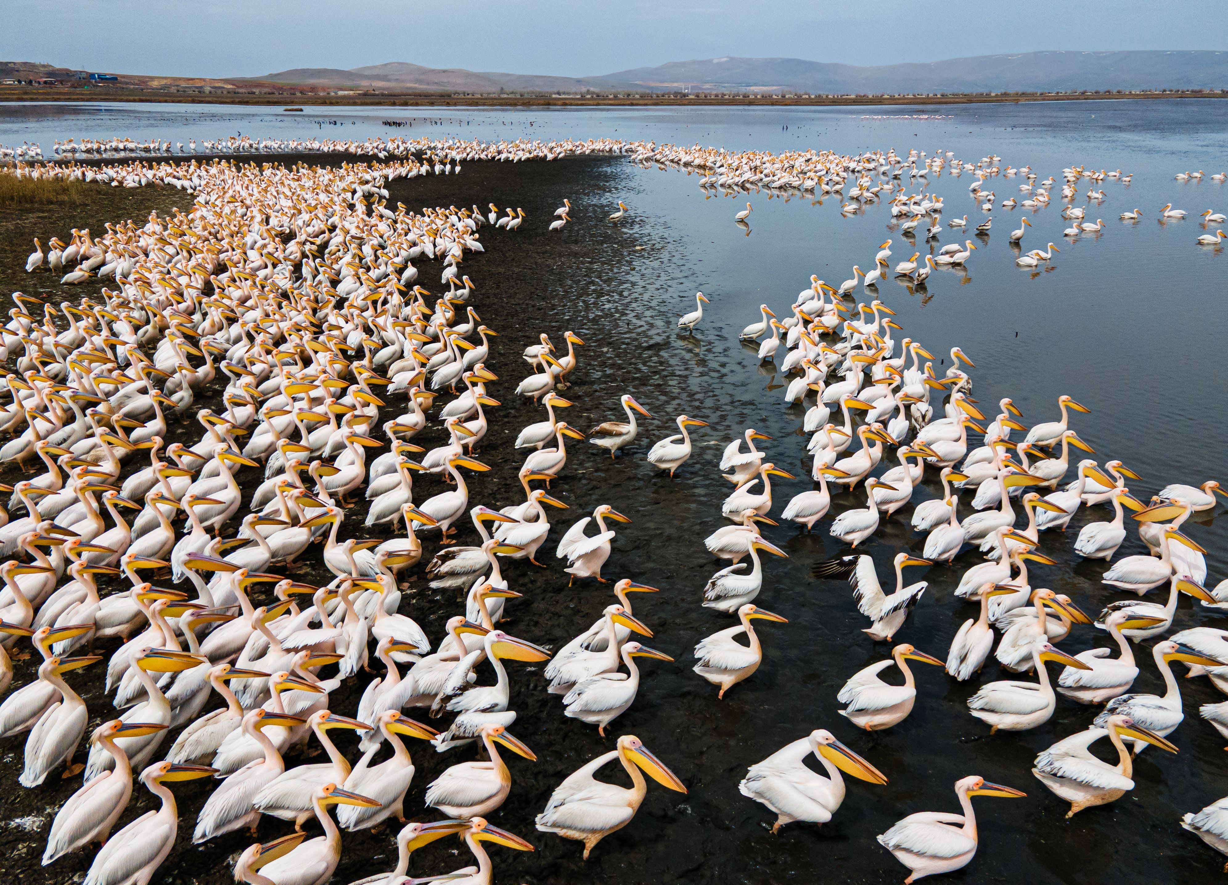 Great white pelicans (Pelecanus onocrotalus) rest in Lake Cavuscu as they migrate from Africa to Europe and Russia with the arrival of spring in Ilgin district of Konya, Turkiye on March 26, 2025. Lake Cavuscu is home to pelicans and migratory birds on the migration route. Lake Cavuscu, where there are suitable conditions for feeding and accommodation, is also home to resident birds. (Photo by Seyit Konyali /Anadolu via Getty Images)