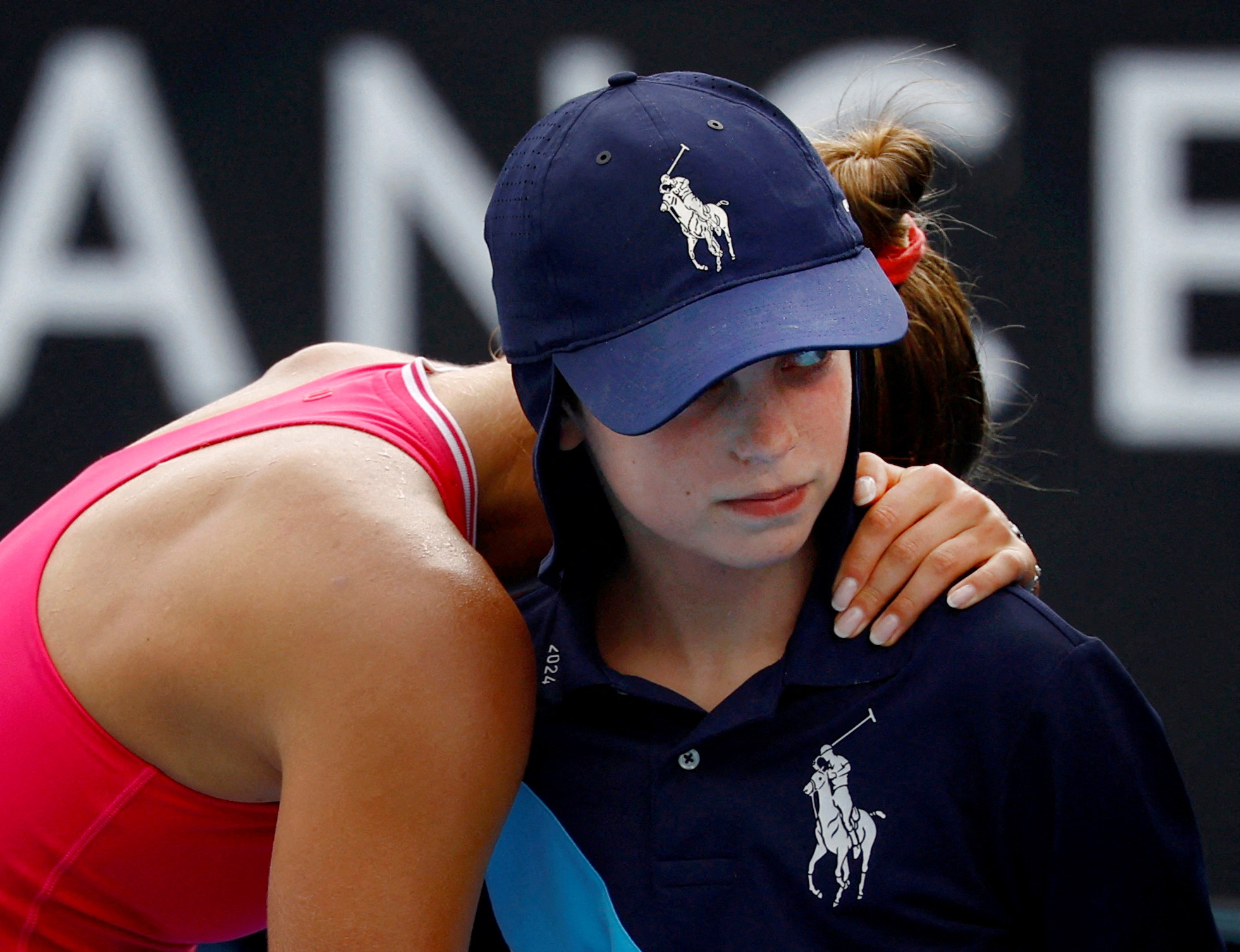 Ukraine's Marta Kostyuk hugs a ball kid after a point against Russia's Elina Avanesyan during their women's singles match on day six of the Australian Open tennis tournament in Melbourne on January 19, 2024. (Photo by Issei Kato/Reuters)