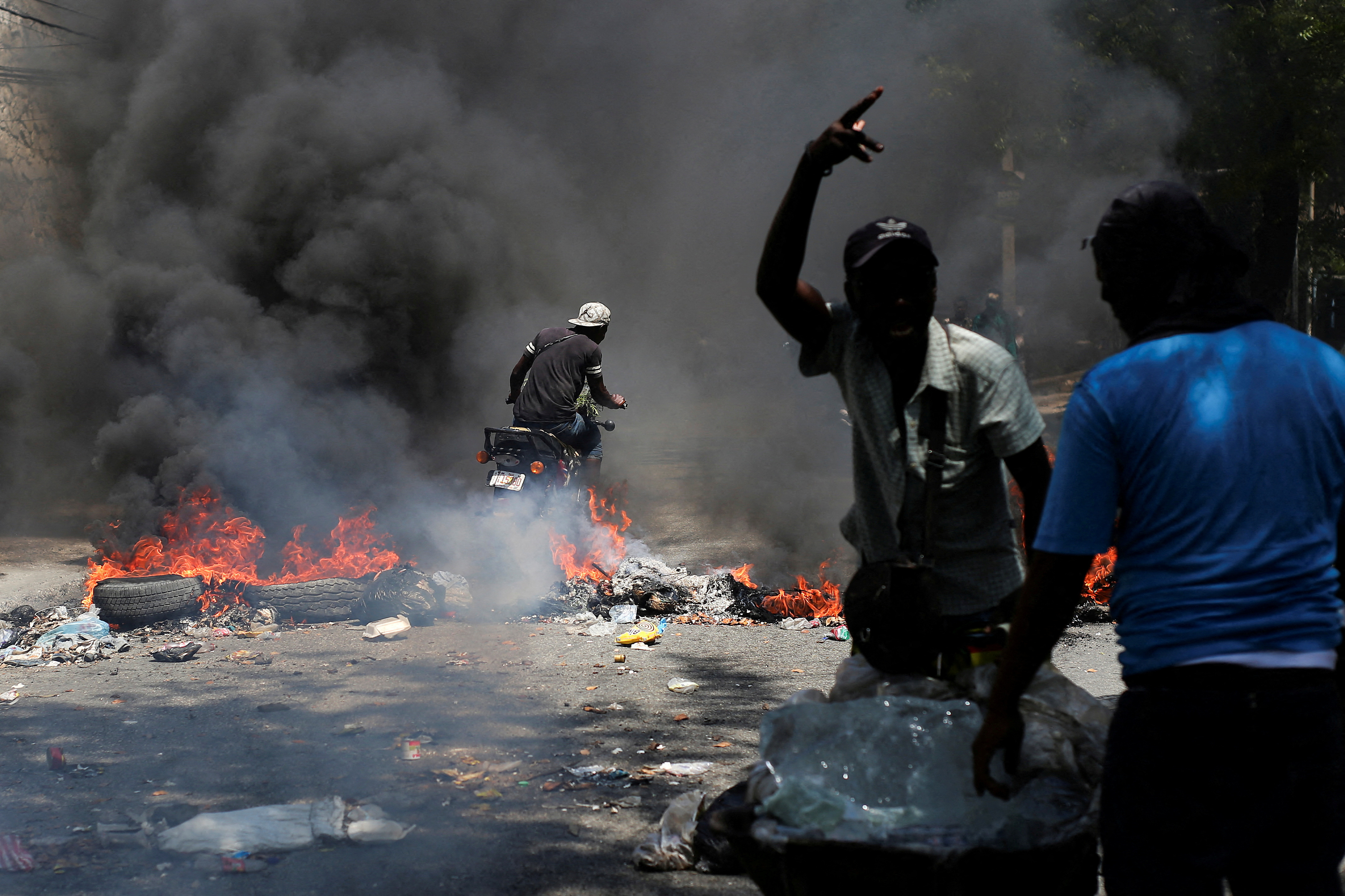 A motorcyclist rides past a burning barricade during a protest against insecurity, in Port-au-Prince, Haiti on March 19, 2025. (Photo by Jean Feguens Regala/Reuters)