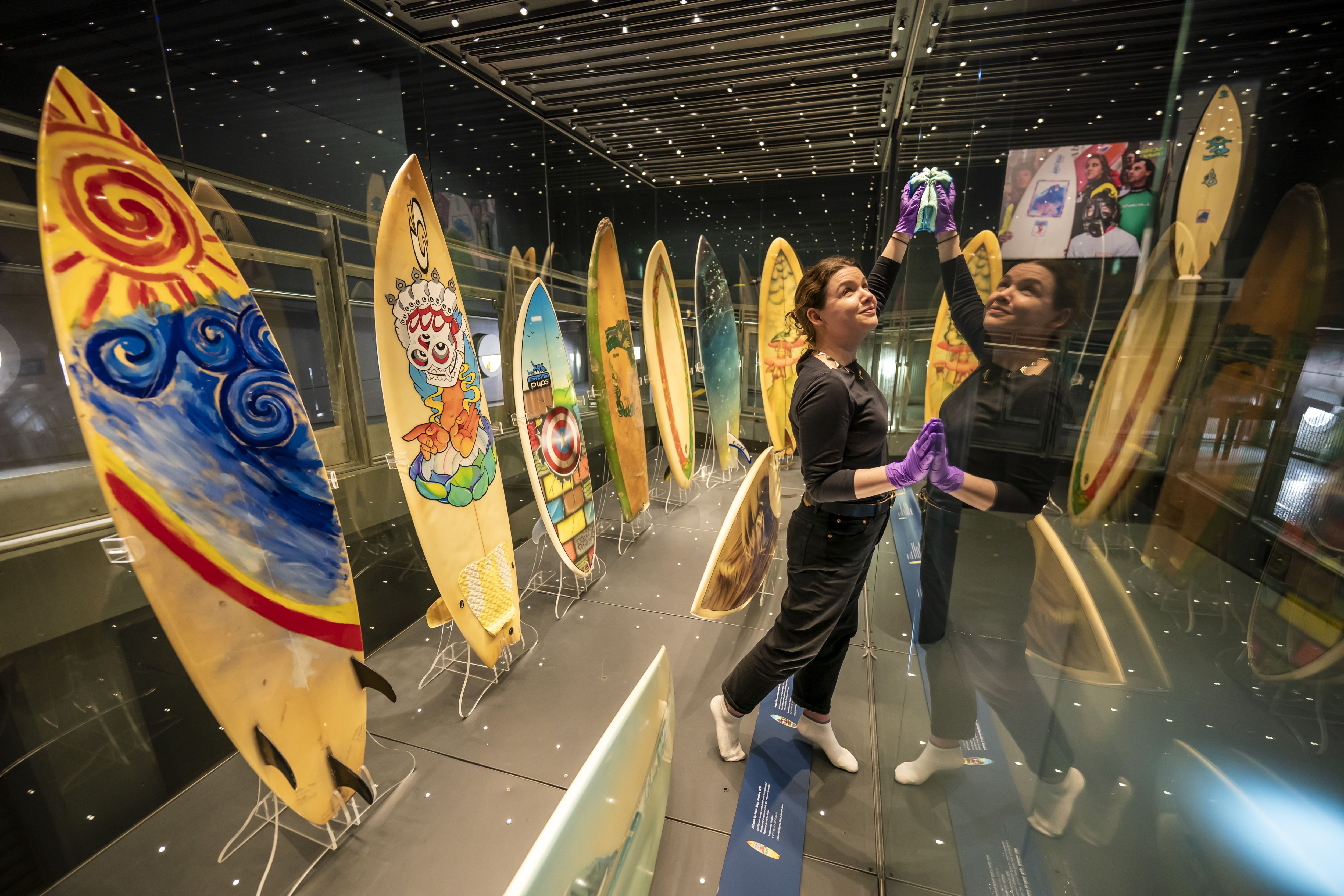 Staff clean and wipe all glass surfaces in large cabinets holding art-decorated surfboards, as final preparations are being made at the new exhibition – SURF! 100 years of waveriding in Cornwall, inside National Maritime Museum Cornwall, in Falmouth, UK on Tuesday, March 25, 2025. The exhibition, opening of Friday March 28th 2025, explores the history and cultural impact of surfing in Cornwall, celebrating a century of surfing and Coirnish surf culture. (Photo by Ben Birchall/PA Wire)
