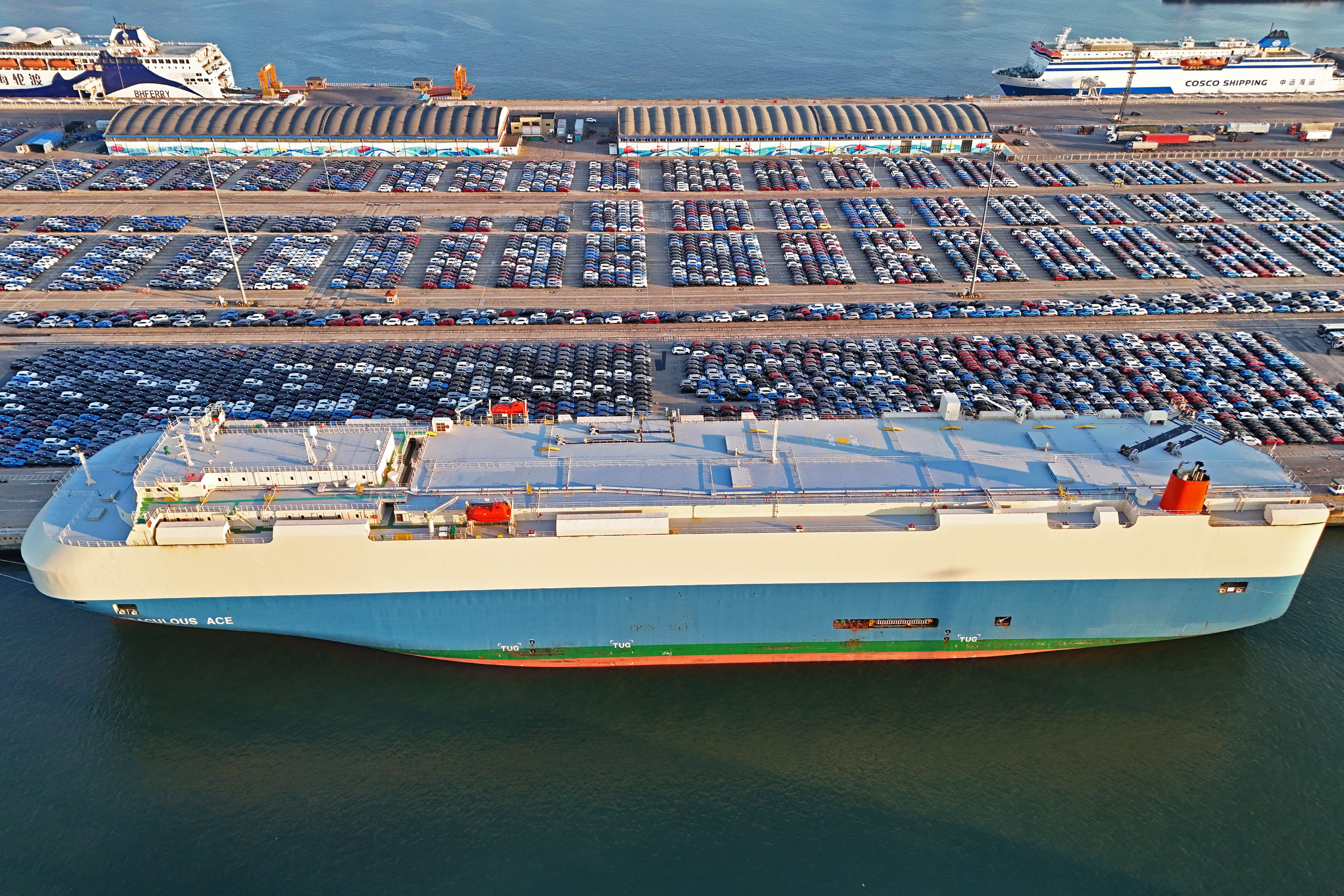 Aerial view of vehicles waiting to be loaded onto a ro-ro ship for export at Yantai Port on March 30, 2025 in Yantai, Shandong Province of China. (Photo by Sun Wentan/VCG via Getty Images)