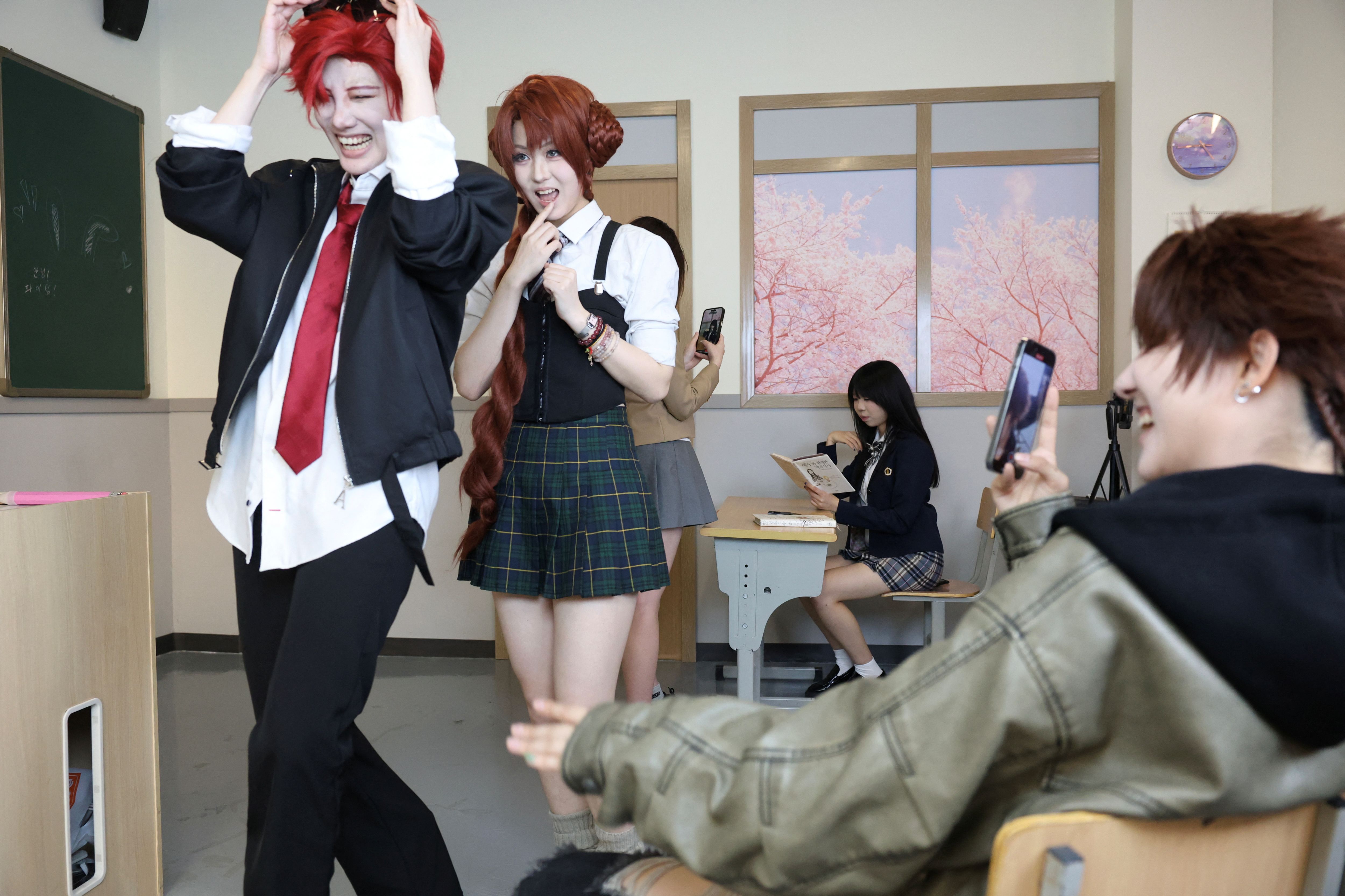 Visitors get their video recorded while wearing costumes at Chen Go, an “idol experience center” where fans dress up as K-Pop idols, in Shanghai, China, on April 5, 2025. (Photo by Go Nakamura/Reuters)