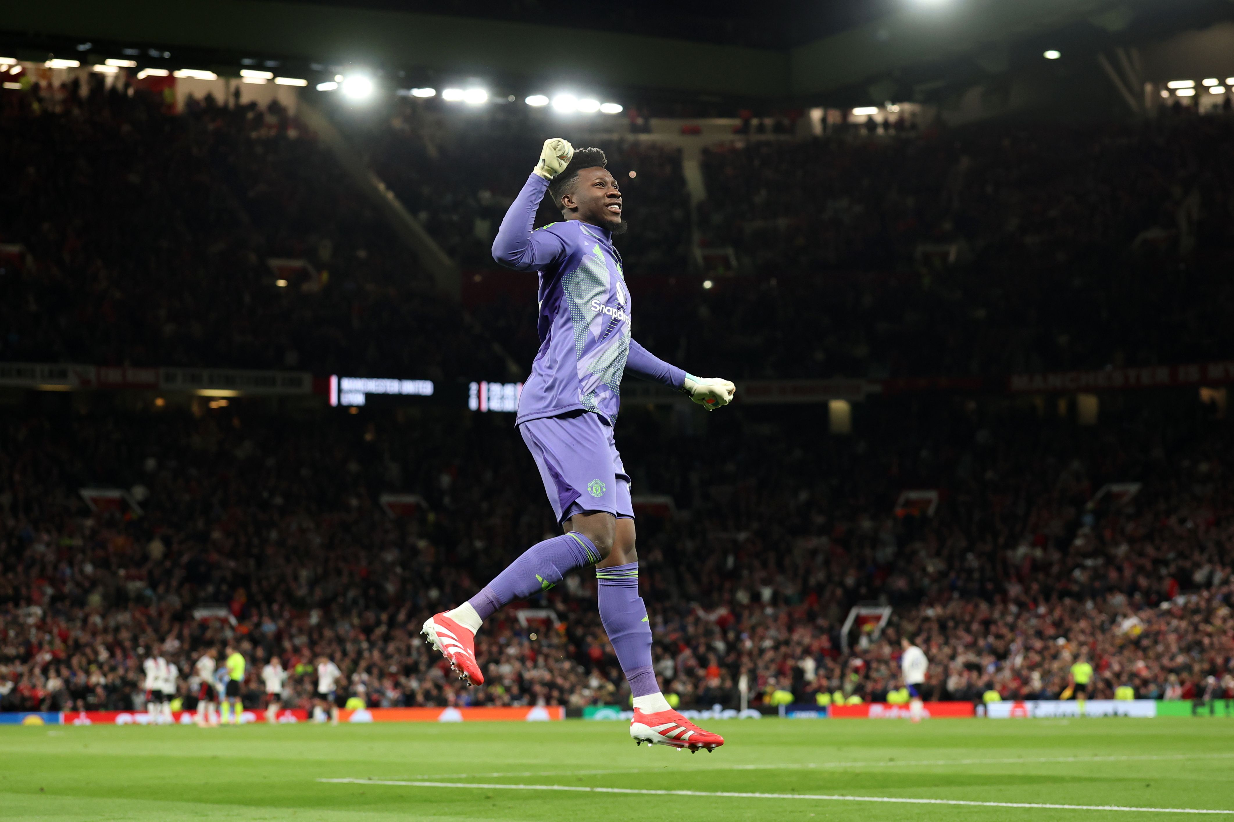 Andre Onana of Manchester United celebrates after Diogo Dalot of Manchester United (not pictured) scores his team's second goal during the UEFA Europa League 2024/25 Quarter Final Second Leg match between Manchester United and Olympique Lyonnais at Old Trafford on April 17, 2025 in Manchester, England. (Photo by Carl Recine/Getty Images)