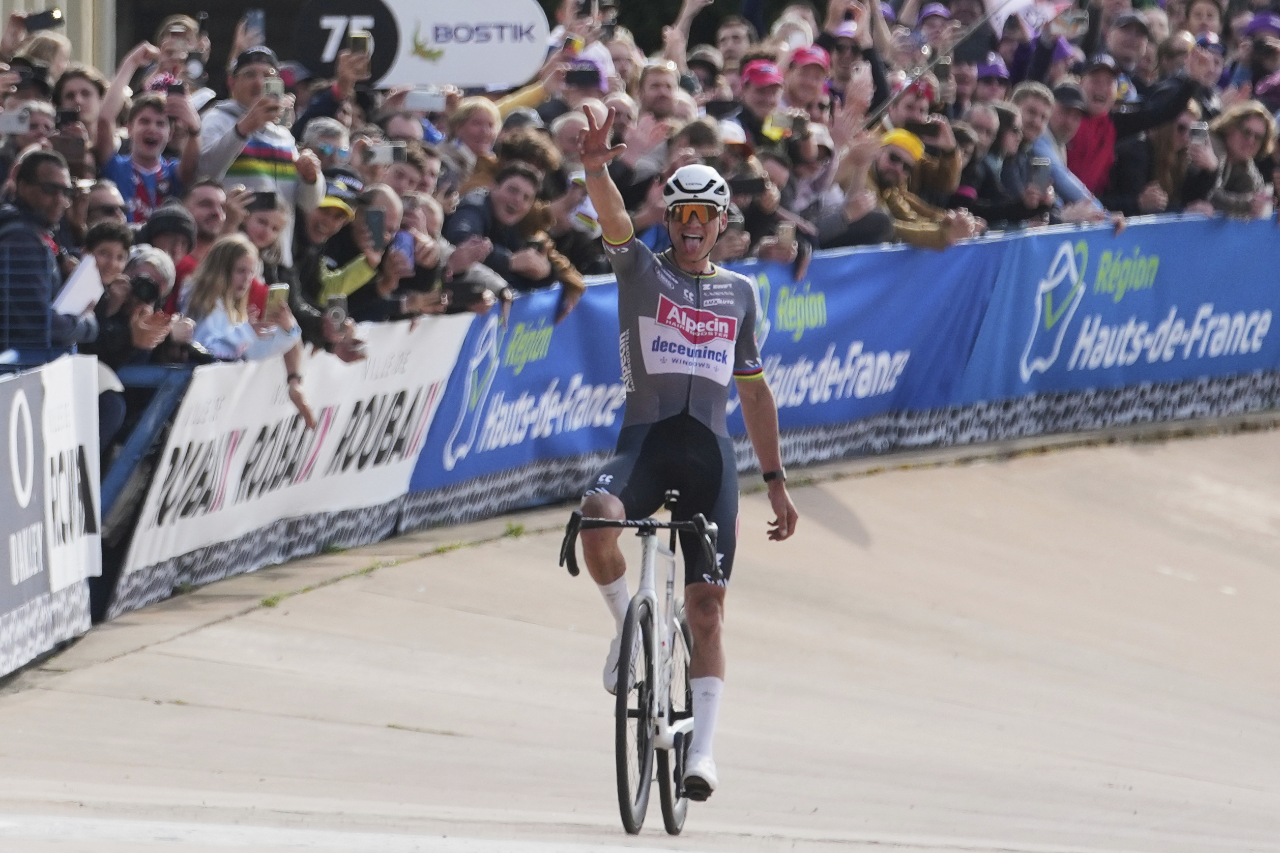 Mathieu van der Poel, of the Netherlands, gestures as he approaches the finish line to win the Paris-Roubaix cycling race for the third time in a row, in Roubaix, France, Sunday, April 13, 2025. (Photo by Thibault Camus/AP Photo)