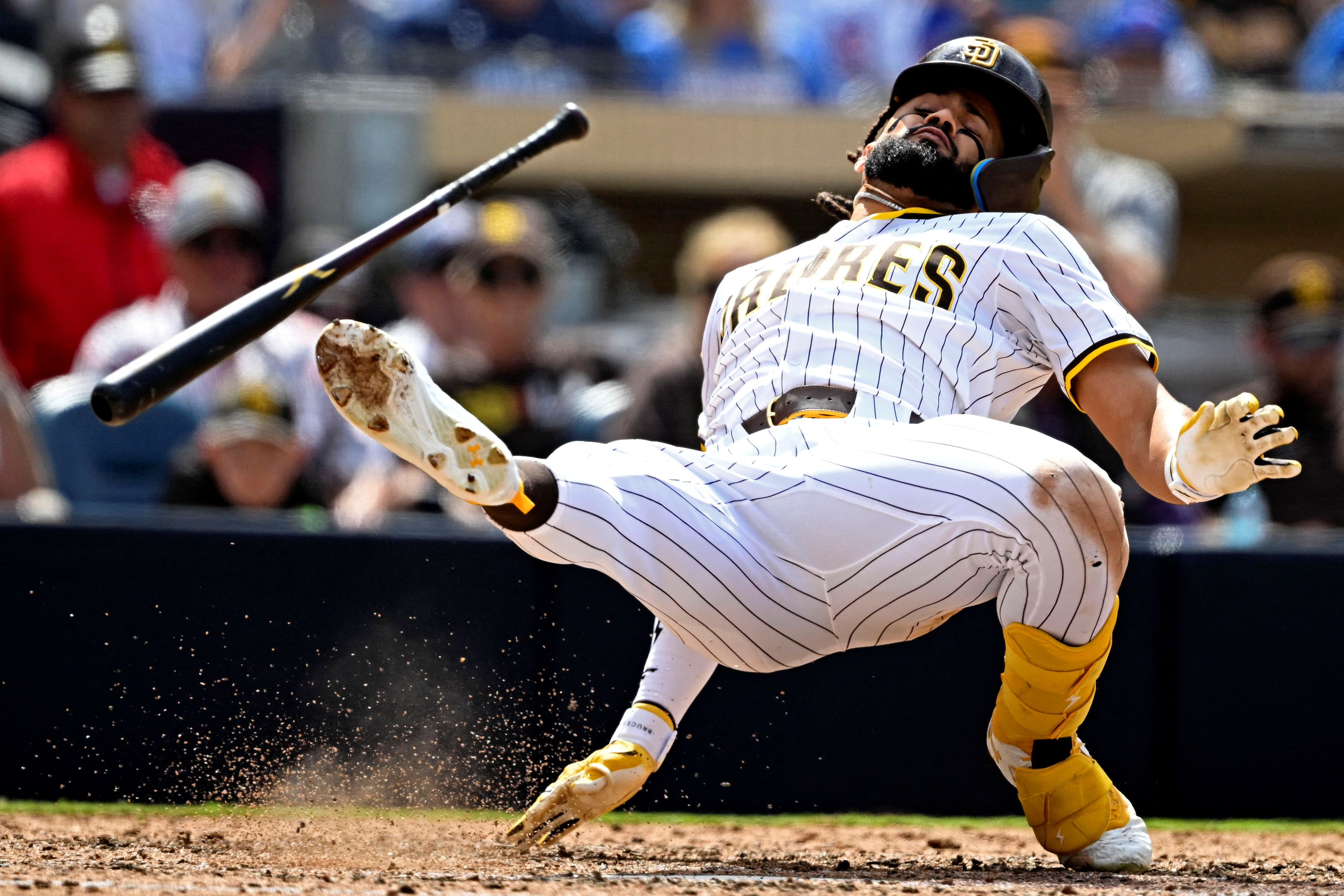 San Diego Padres right fielder Fernando Tatis Jr. (23) dodges a pitch during the seventh inning against the Chicago Cubs at Petco Park in San Diego, California on April 16, 2025. (Photo by Denis Poroy/Reuters)