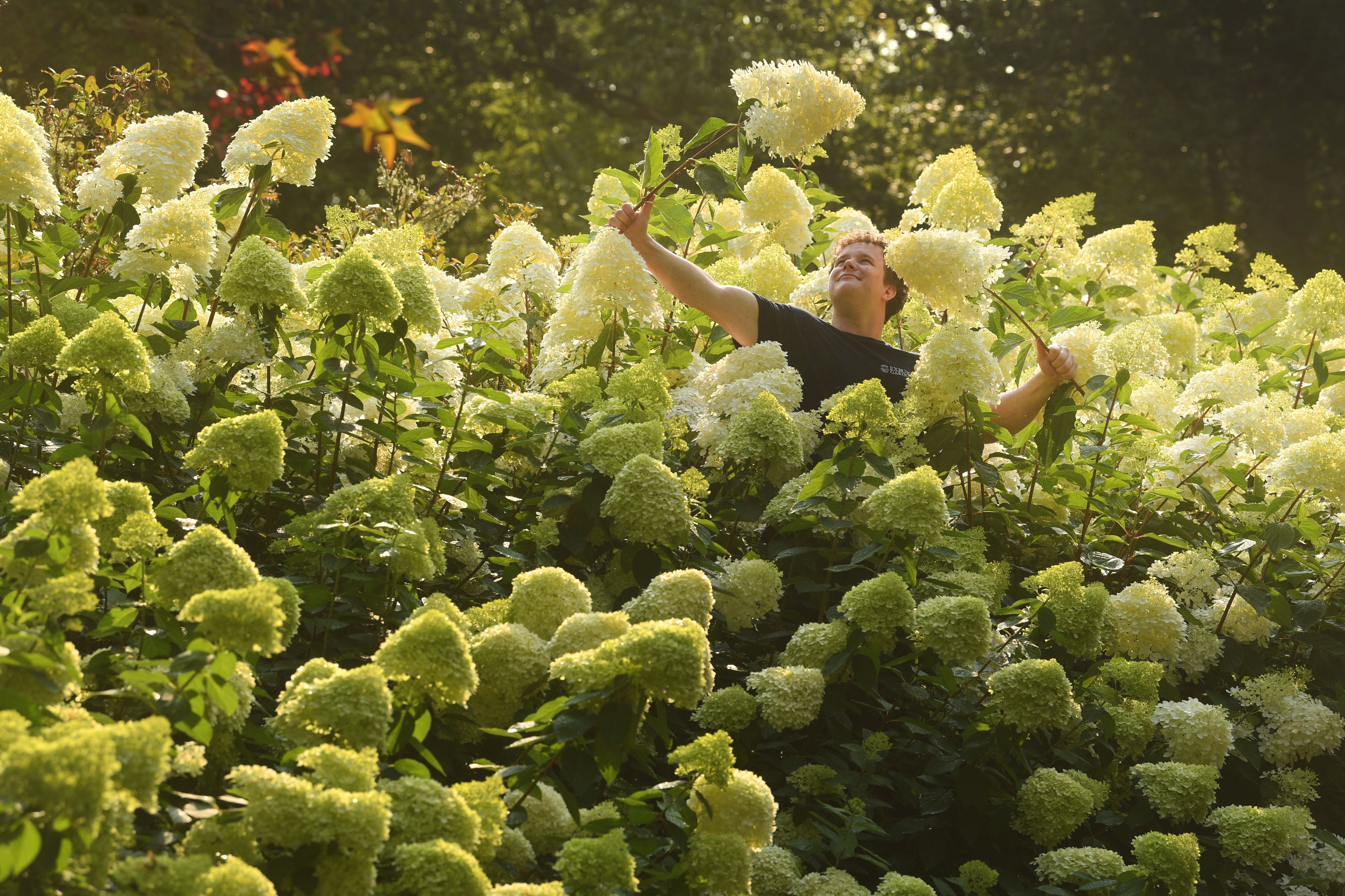 Declan Belcher, a gardener at Exbury Gardens in Southampton, UK inspects the opening panicles of the Hydrangea paniculata, known as “Phantom” early August 2024. The estate has a dedicated hydrangea walk, equivalent to the length of six Olympic-sized swimming pools. (Photo by Russell Sach/The Times)