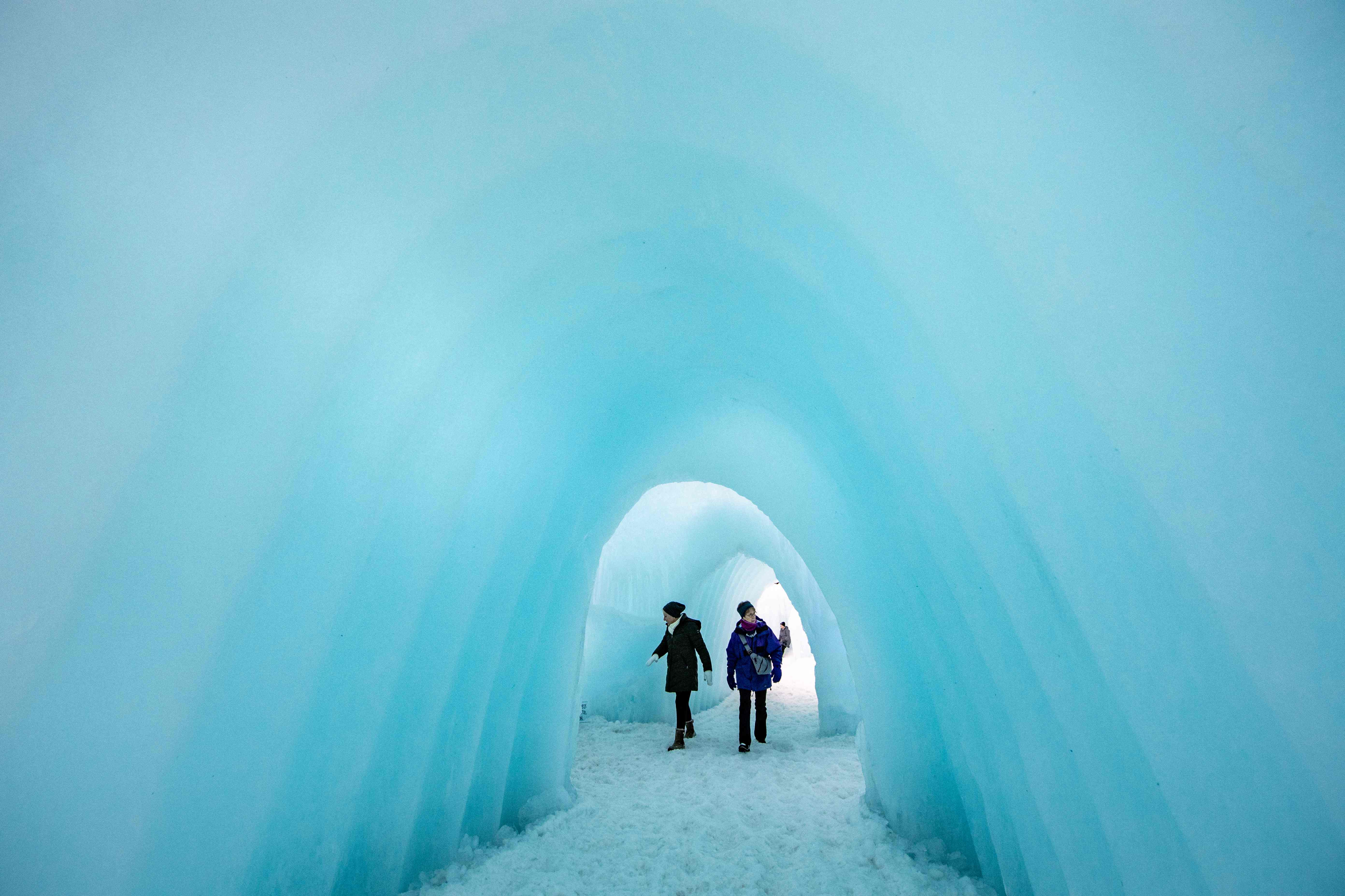 People explore the ice walls, trails and caverns at Ice Castles in North Woodstock, New Hampshire on February 1, 2024. Founder Brent Christensen, crafted his first icy creation in the front yard of his home to bring happiness and joy to his children. Since 2011, Ice Castles has been dedicated to creating a world of ice caves, frozen waterfalls, and glaciers formed into archways, caverns, slides, and tunnels. (Photo by Joseph Prezioso/AFP Photo)