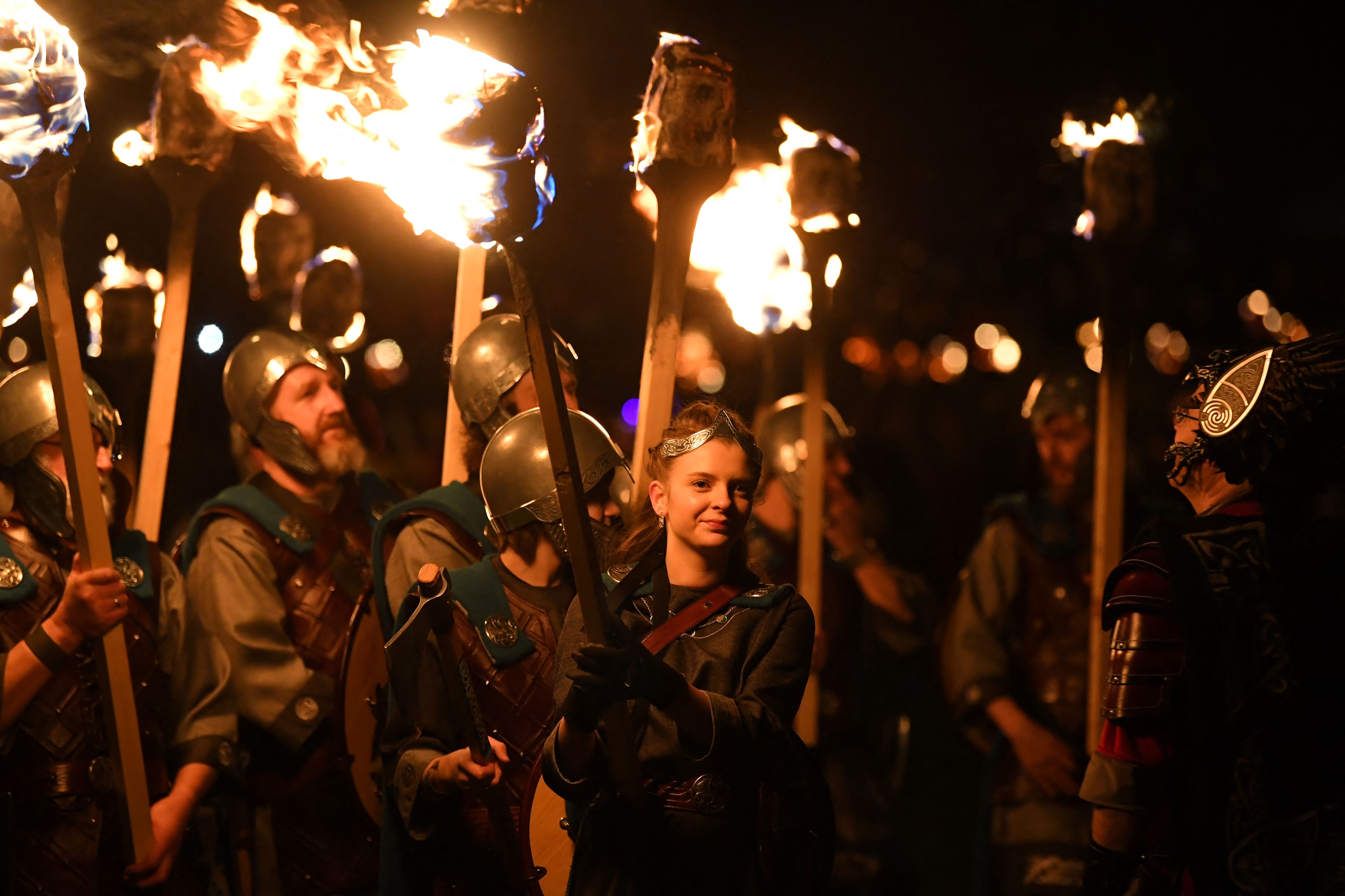 Members of the Up Helly Aa “Jarl Squad” parade through the streets of in Lerwick, Shetland Islands on January 30, 2024 during the Up Helly Aa festival later in the day. Up Helly Aa celebrates the influence of the Scandinavian Vikings in the Shetland Islands and culminates with up to 1,000 “guizers” (men in costume) throwing flaming torches into their Viking longboat and setting it alight later in the evening. (Photo by Andy Buchanan/AFP Photo)