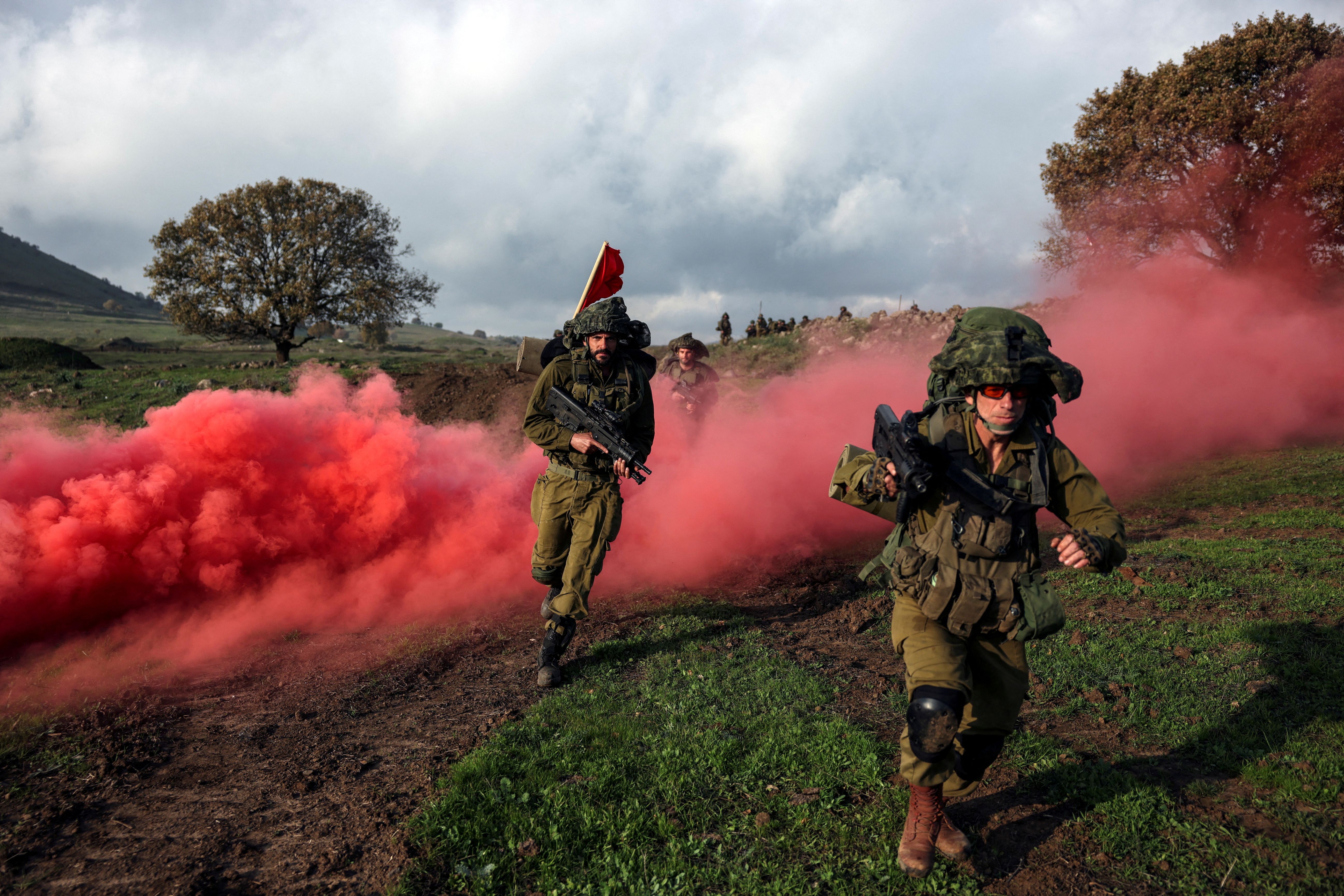 Israeli soldiers take part in a drill at the Israeli-occupied Golan Heights, amid the ongoing conflict between Israel and the Palestinian Islamist group Hamas on January 4, 2024. (Photo by Ronen Zvulun/Reuters)