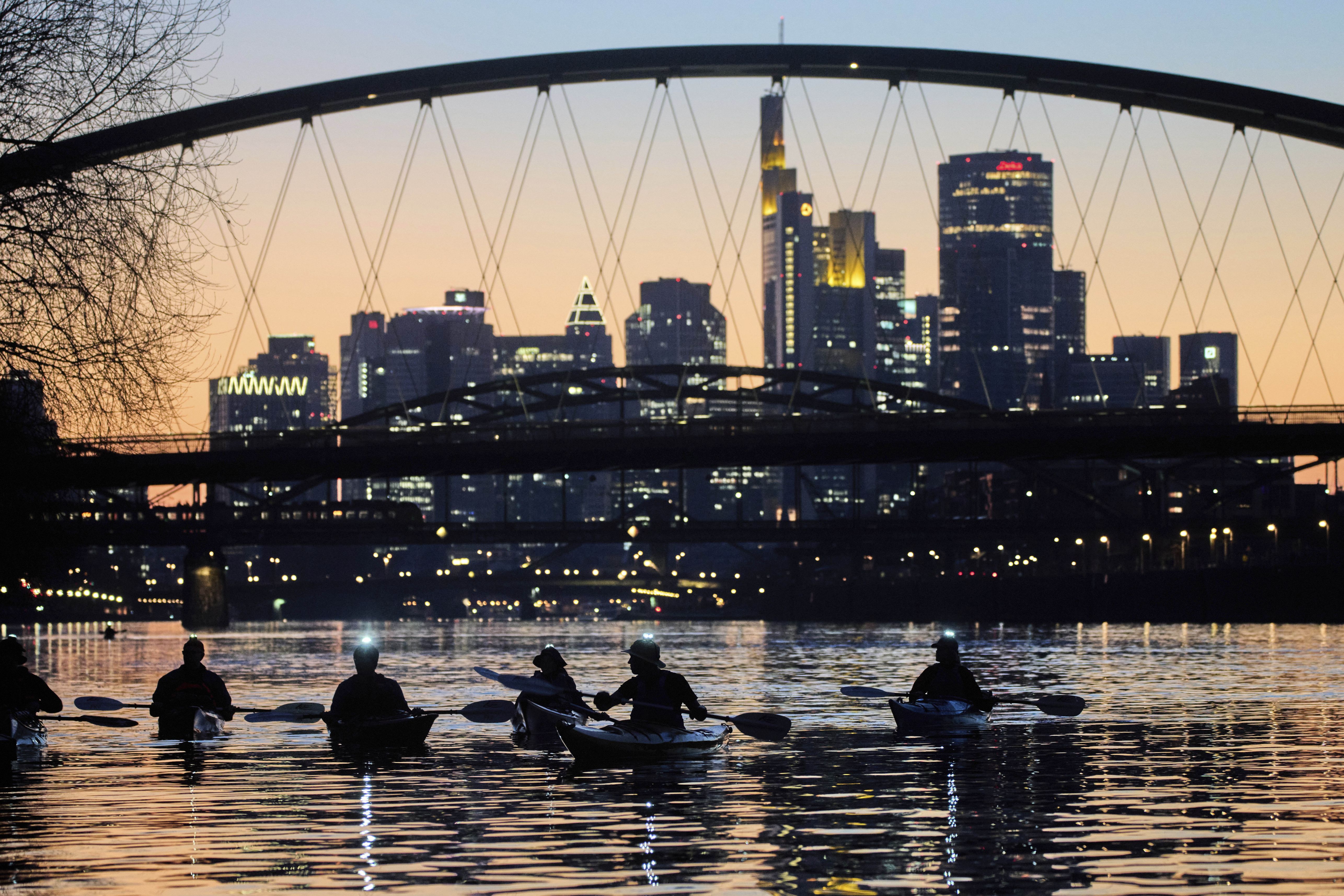 Paddlers use lights on their helmets as they navigate the River Main in Frankfurt, Germany, late Thursday, March 27, 2025. (Photo by Michael Probst/AP Photo)