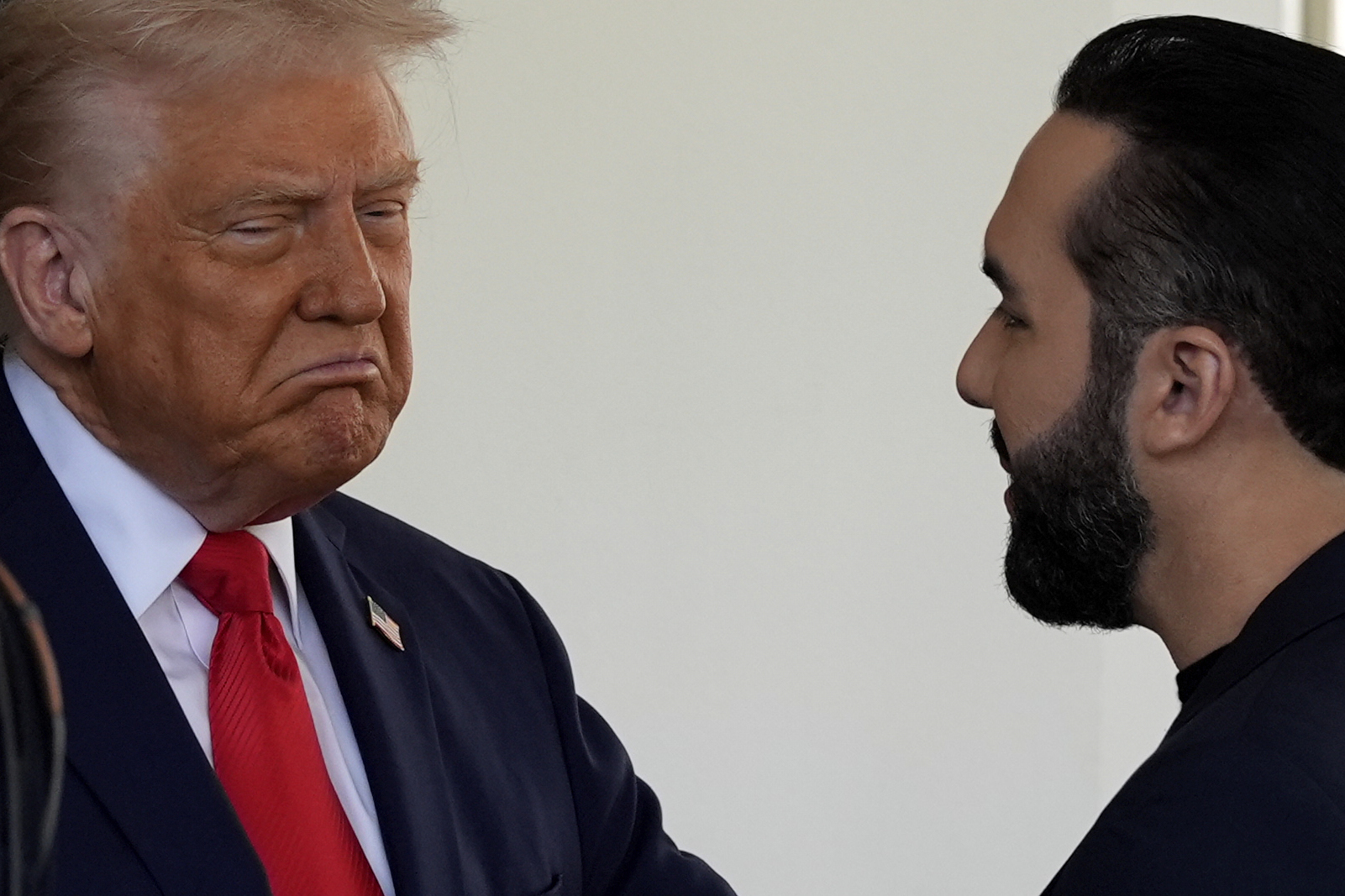 President Donald Trump greets El Salvador's President Nayib Bukele as he arrives at the West Wing of the White House, Monday, April 14, 2025, in Washington. (Photo by Alex Brandon/AP Photo)