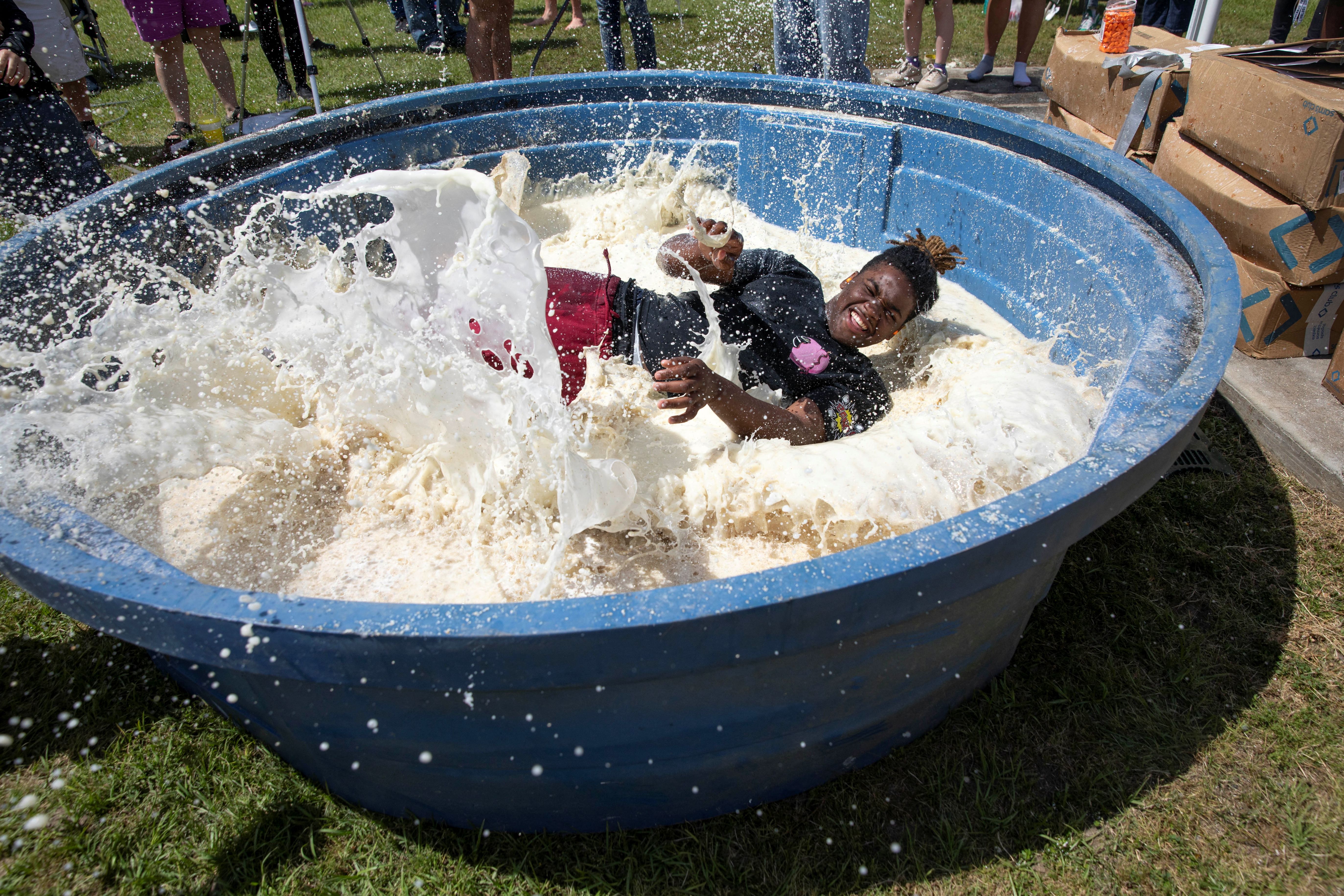 Mark Walker jumps into a pool of grits while competing in the grit pit competition during the National Grits Festival in Warwick, Georgia, U.S., April 12, 2025. (Photo by Alyssa Pointer/Reuters)