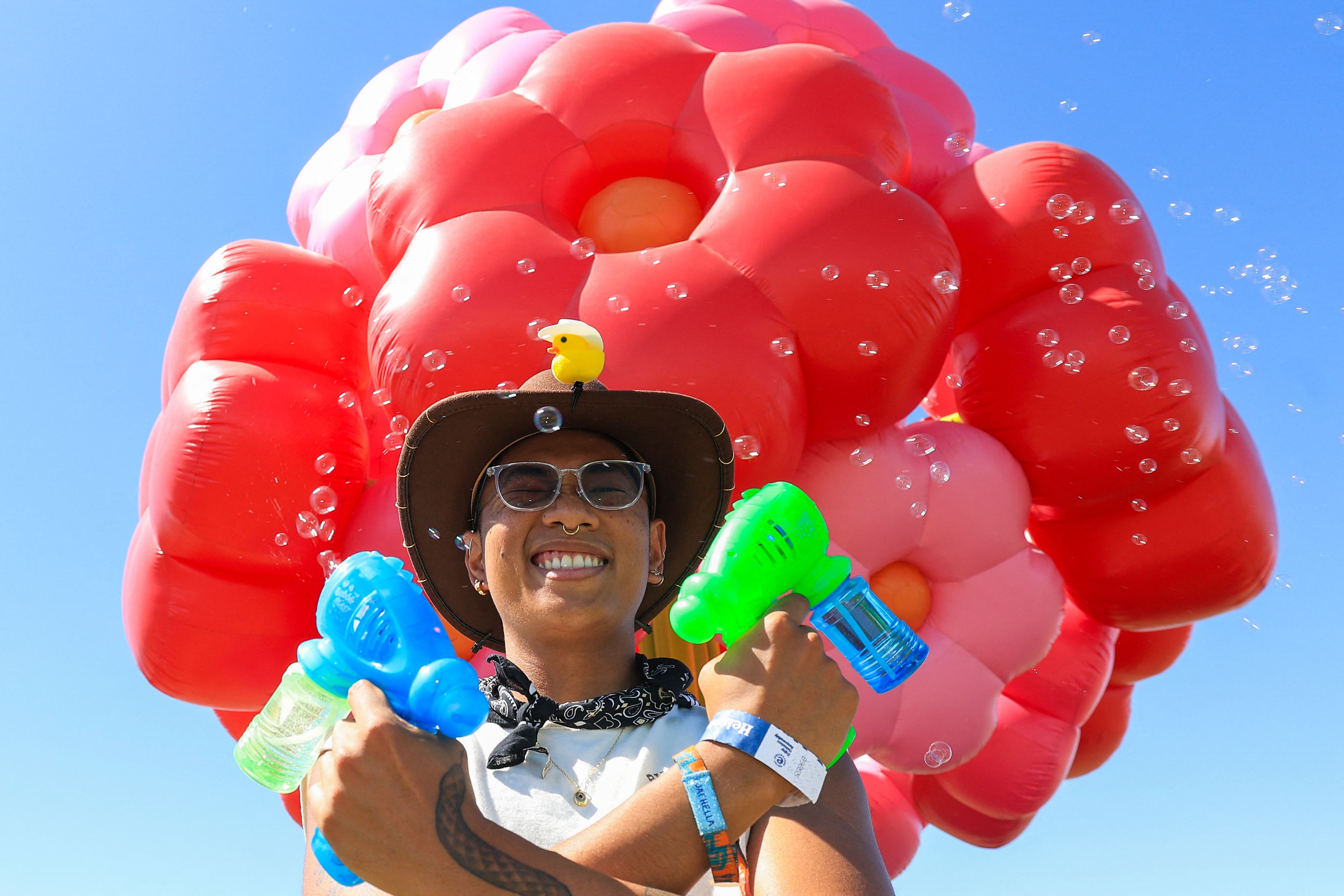 A festivalgoer plays with bubbles as he poses for a photo by French design collective Uchronia's “Le Grand Bouquet” large-scale floral art installation during the 2025 Coachella Valley Music and Arts Festival at Empire Polo Club on April 13, 2025 in Indio, California. (Photo by Valerie Macon/AFP Photo)