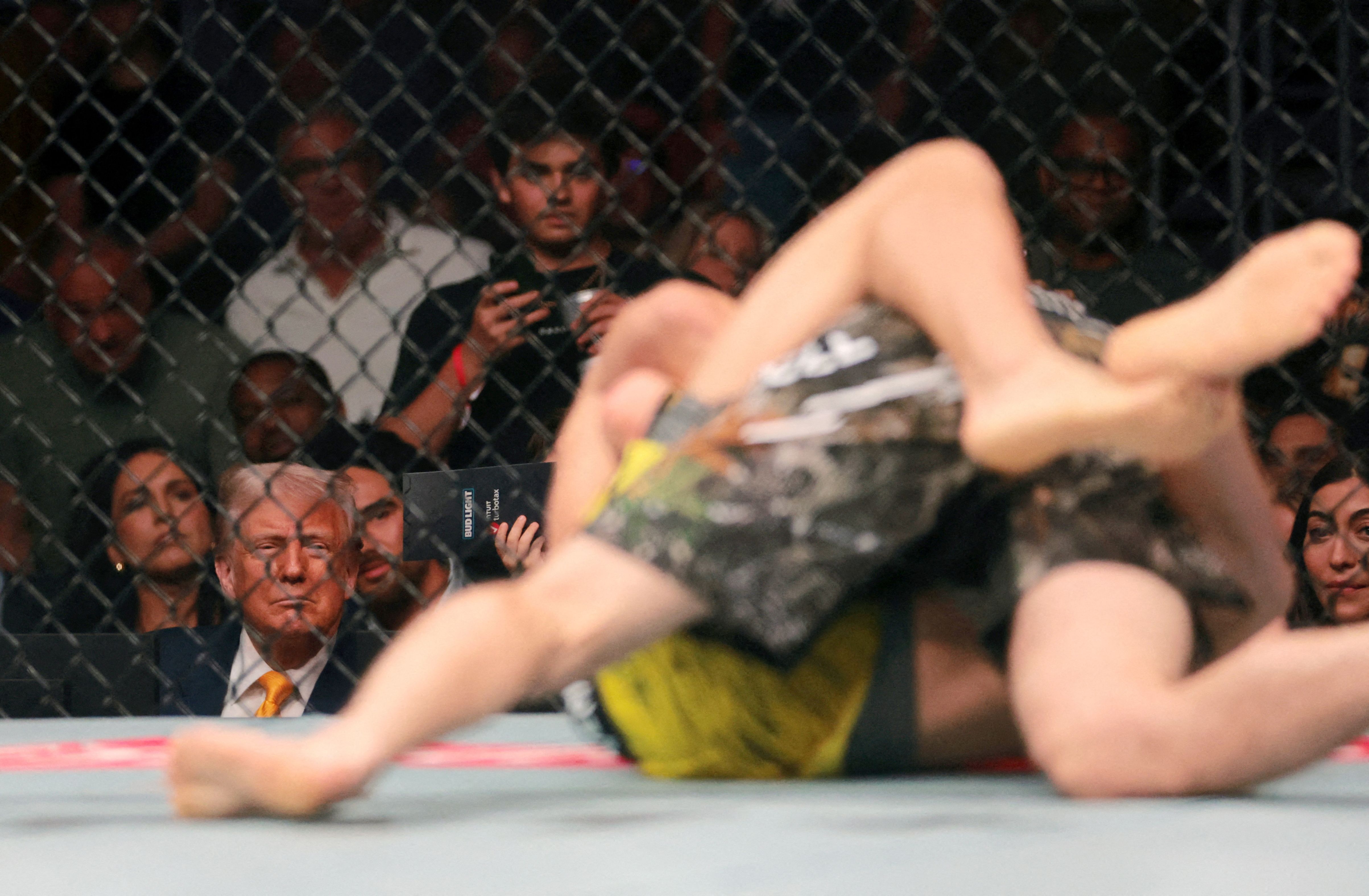 Bryce Mitchell (red gloves) fights against Jean Silva (blue gloves) as President Donald Trump watches during UFC 314 at in Miami, Florida on April 13, 2025. (Photo by Sam Navarro/Reuters)