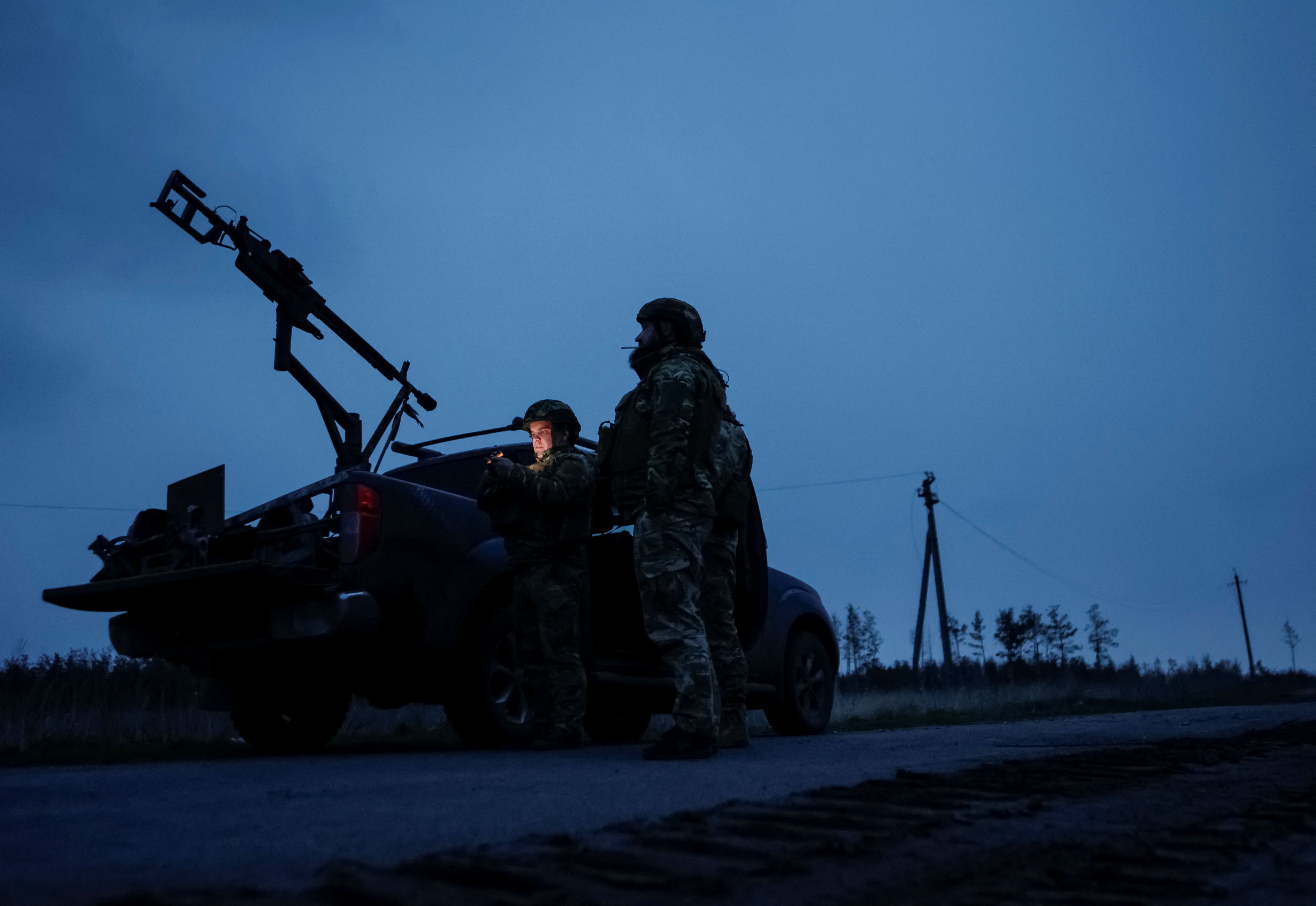Servicemen from anti-drone mobile air defence unit of 115th Separate Mechanized Brigade of the Ukrainian Armed Forces are seen at their position, amid Russia's attack on Ukraine, in Donetsk region, Ukraine on April 7, 2025. (Photo by Sofiia Gatilova/Reuters)