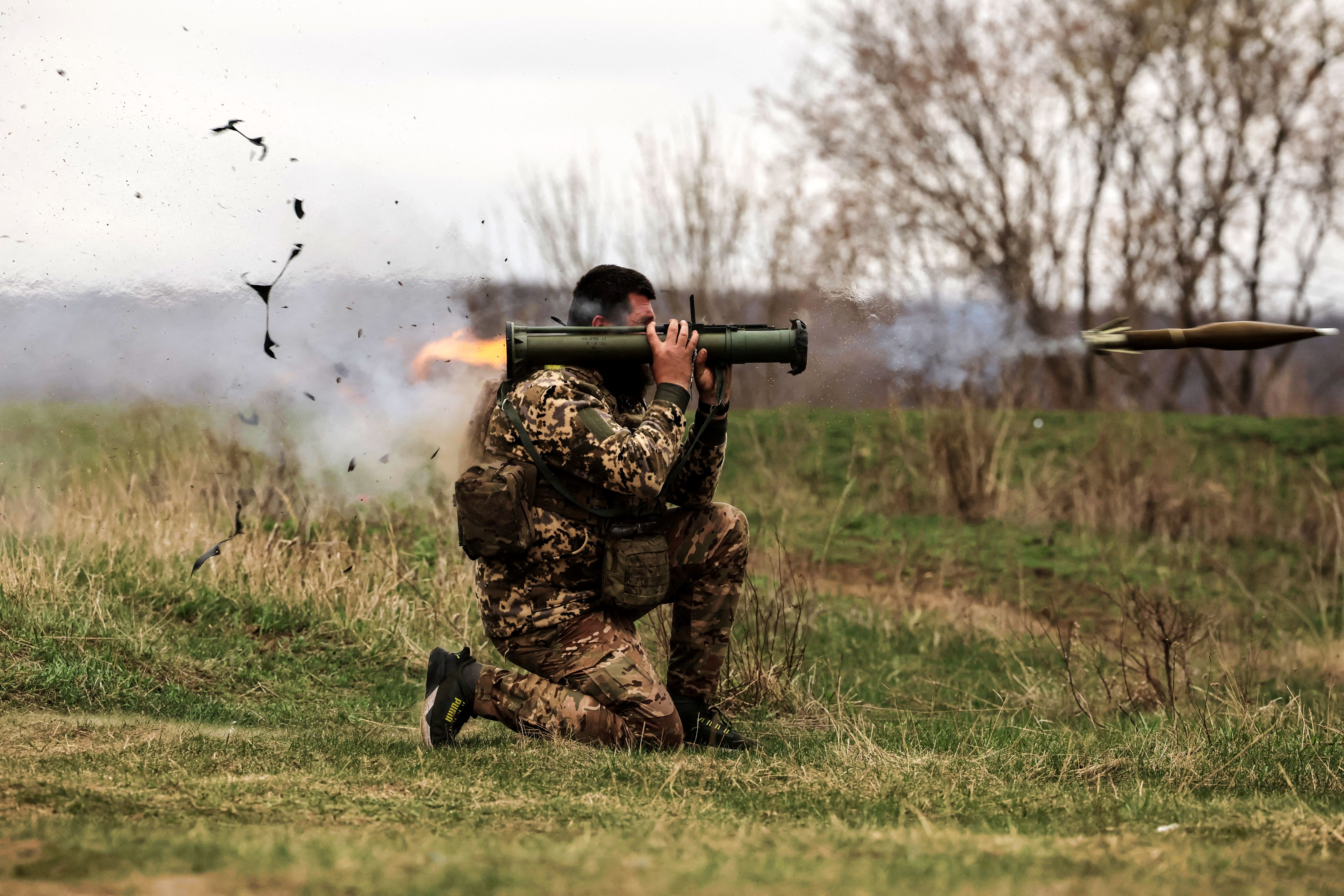 A serviceman of Ukraine's 24th Mechanized Brigade uses a grenade launcher during a training exercise, in an undisclosed location in the east of Ukraine on March 30, 2025. (Photo by Oleg Petrasiuk/Ukrainian Armed Forces)