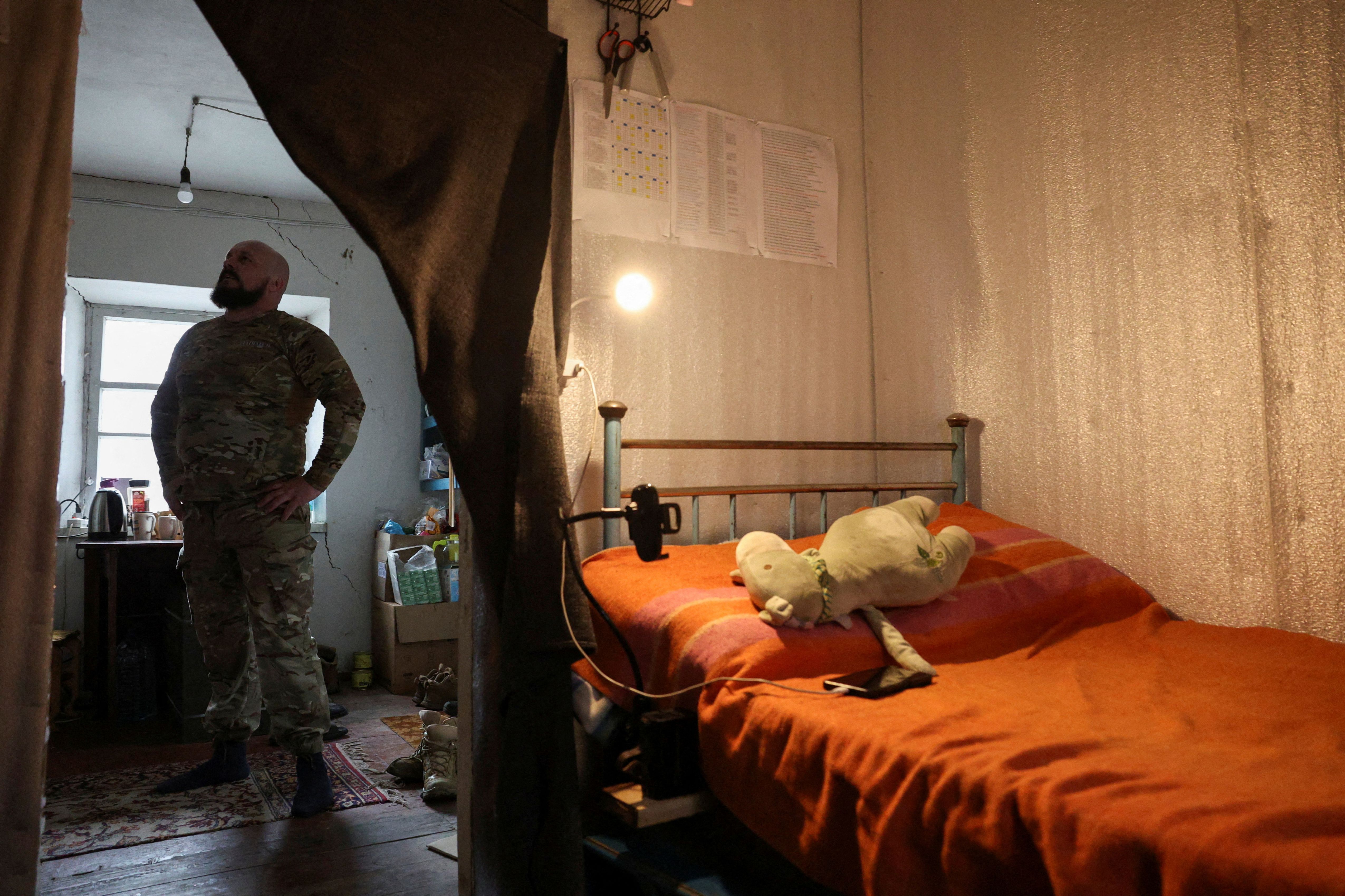 An officer of Ukraine's 2nd Self-Proppelled Battery of the 59th Assault Brigade from the Vinnytsia region, callsign “Black Jack”, on rotation out of the eastern combat zone, pauses outside his bedroom where a stuffed toy belonging to his daughter lies on his bed, at a resting house during a five-day leave in the rear of the frontlines at an undisclosed location in the Dnipropetrovsk region before returning to the Pokrovsk defense effort, in Ukraine, on April 1, 2025. (Photo by Violeta Santos Moura/Reuters)