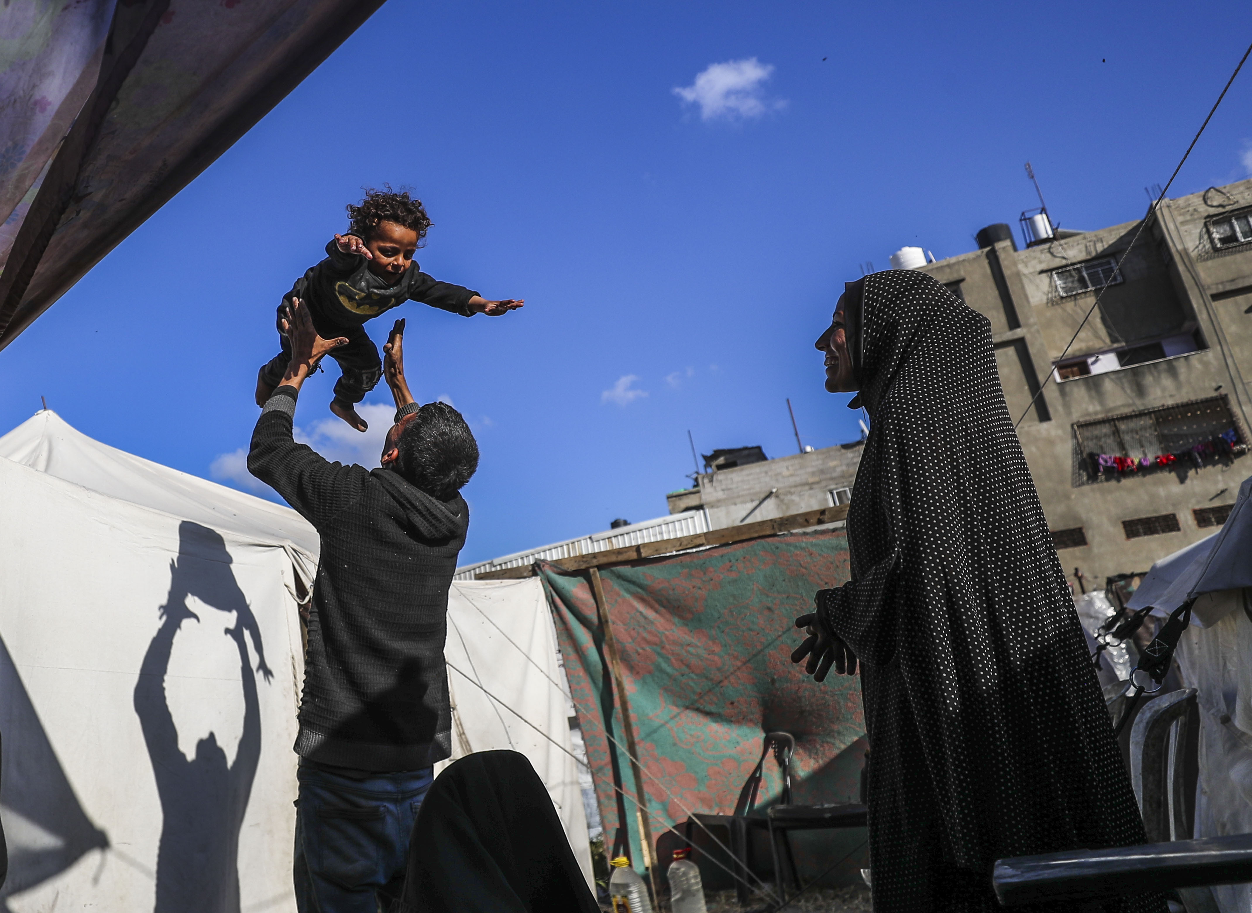 36-year-old Palestinian Mohammad Bakrun and his family, living in a makeshift tent set up on roadside, try to maintain their daily lives despite difficult conditions, in Gaza City, Gaza on April 05, 2025. (Photo by Mahmoud ssa/Anadolu via Getty Images)