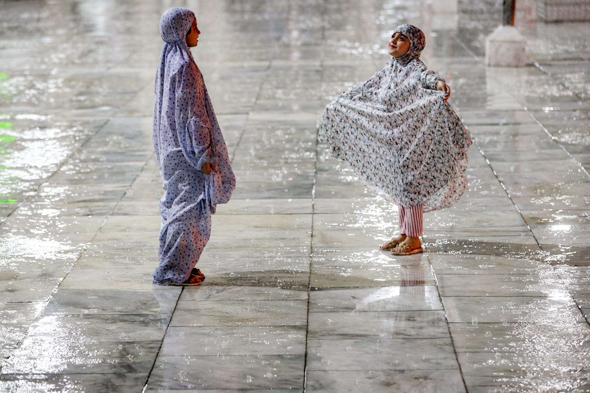 Young Muslim worshippers stand in the rain at the shrine of the 12th-century Sunni cleric Abdul Qadir al-Jilani (Gilani) in Baghdad as people gather to perform the prayers for Eid al-Fitr, which marks the end of the Muslim holy fasting month of Ramadan, as observed locally on March 31, 2025. (Photo by Ahmad Al-Rubaye/AFP Photo)