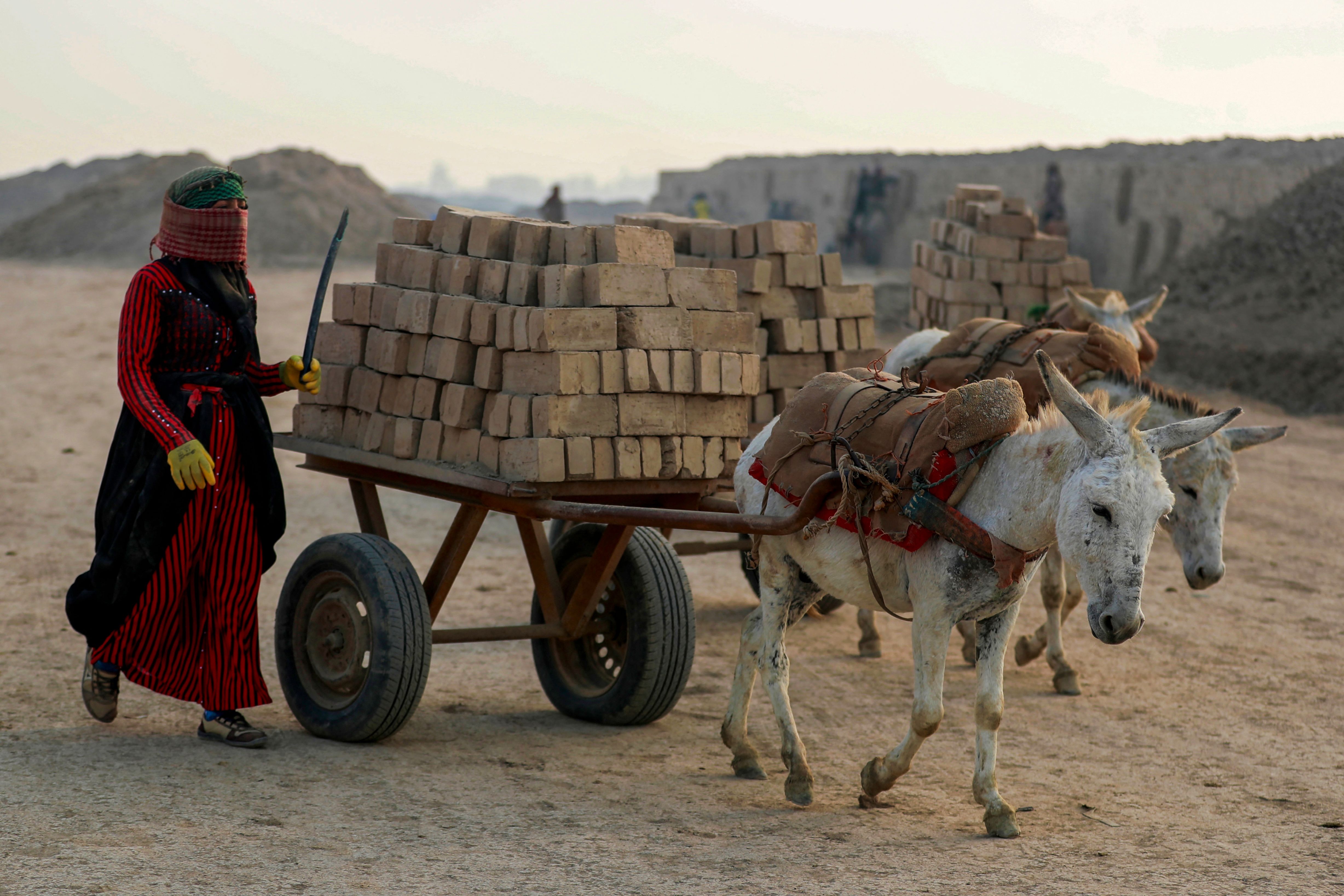 An Iraqi female labourer directs a donkey-pulled cart loaded with clay bricks, at a factory in al-Kifl district on the outskirts of Hilla in central Iraq, on February 10, 2025. Economic hardship has pushed five percent of Iraq's children into labour, a UN study found in 2018, often in harsh conditions and at a risk to their health. (Photo by Ahmad Al-Rubaye/AFP Photo)