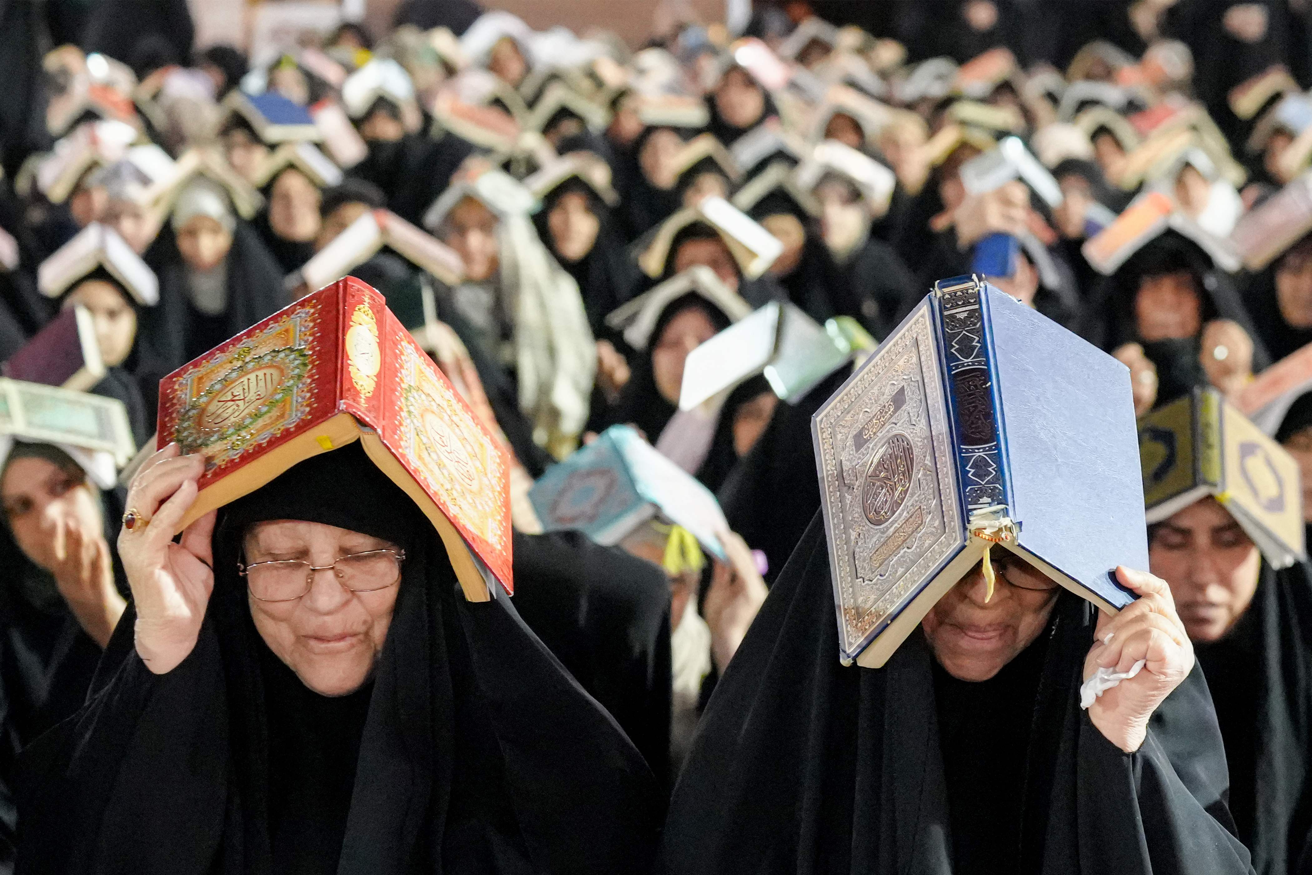 Shiite Muslim devotees sit in prayer while having copies of the Koran, Islam's holy book, placed on the head as they attend mass prayers for Laylat al-Qadr, or the Night of Destiny, during the holy fasting month of Ramadan at the Great Mosque of Kufa in Iraq's central holy shrine city of Kufa on March 23, 2025. (Photo by Qassem Al-Kaabi/AFP Photo)